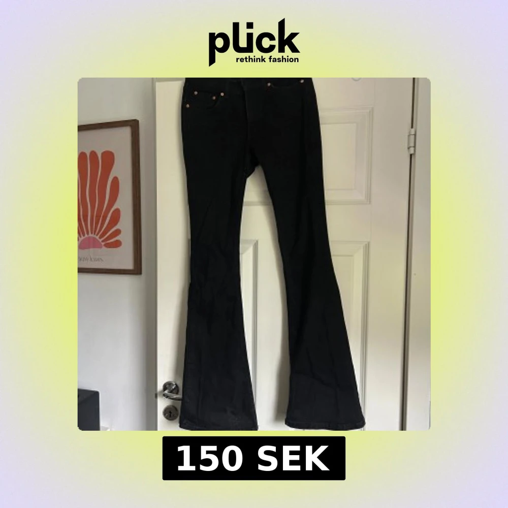 svarta jeans med bootcut passform, tillverkade i ett mjukt bomullstyg med stretch för extra komfort. Inget fel på dem, säljer av massa av mina kläder då jag har bytt stil och vissa av kläderna är försmått för mig nu. Stl 36 och är från Gina tricot