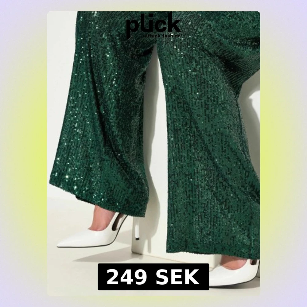Mörkgröna byxor från Ane Mone, täckta med glittriga paljetter. Modellen är Palmer Trouser med breda, raka ben och hög midja. Perfekta för dig som vill ha ett statement-plagg som verkligen syns.