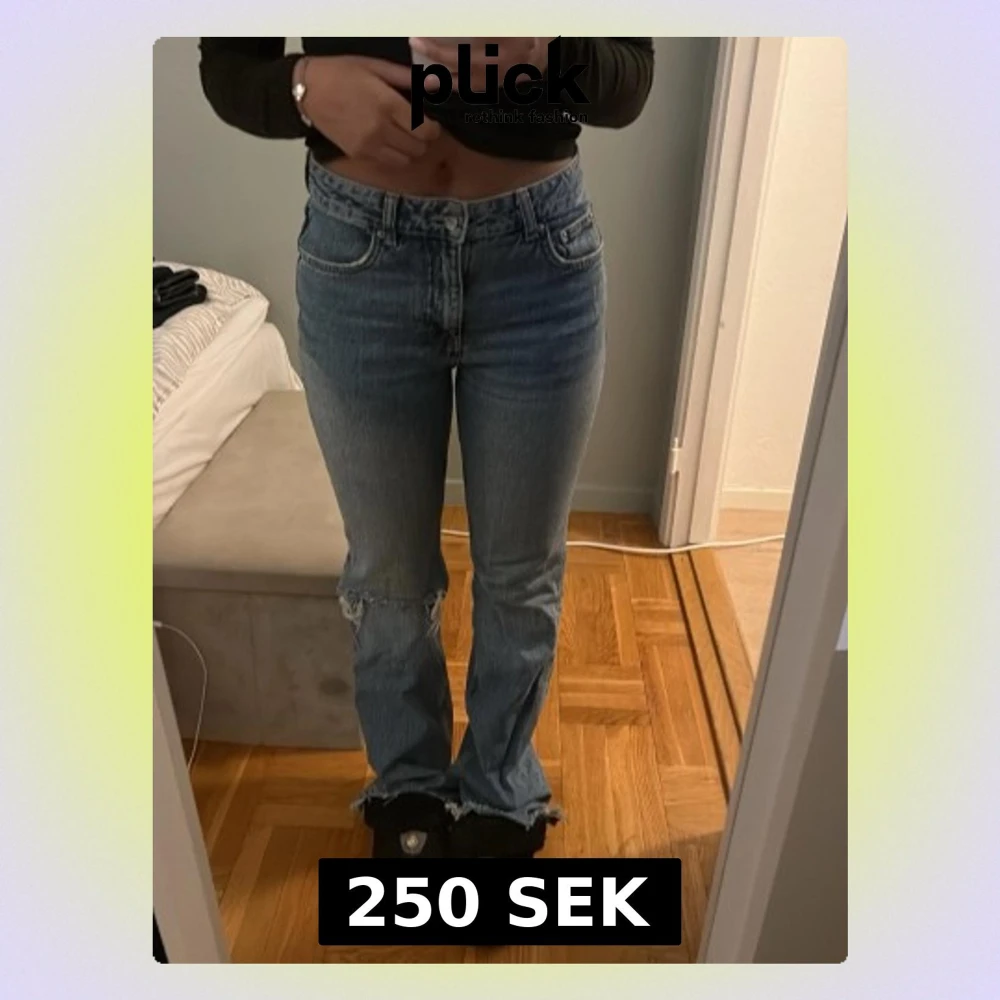 Säljer ett par klassiska blå jeans från Gina Tricot i storlek 36. Modellen har bootcut-ben, hög midja och råa kanter nertill samt slitningar och hål vid knäet.