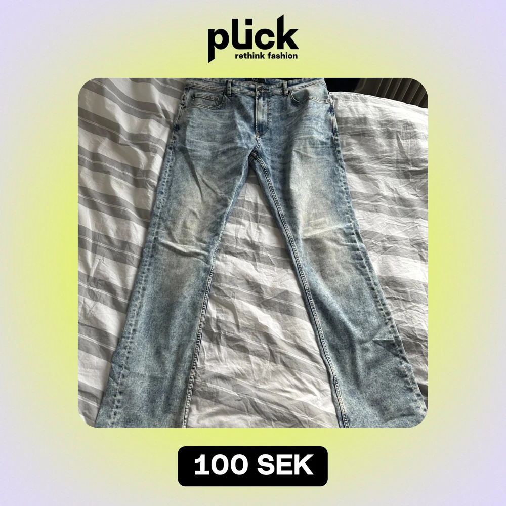 Säljer ett par ljusblå jeans från Smog i storlek 36/34. De har en klassisk femficksdesign och en snygg tvättad look. Perfekta för vardagsbruk och kan enkelt matchas med olika outfits. Passar bra för både vår och sommar.