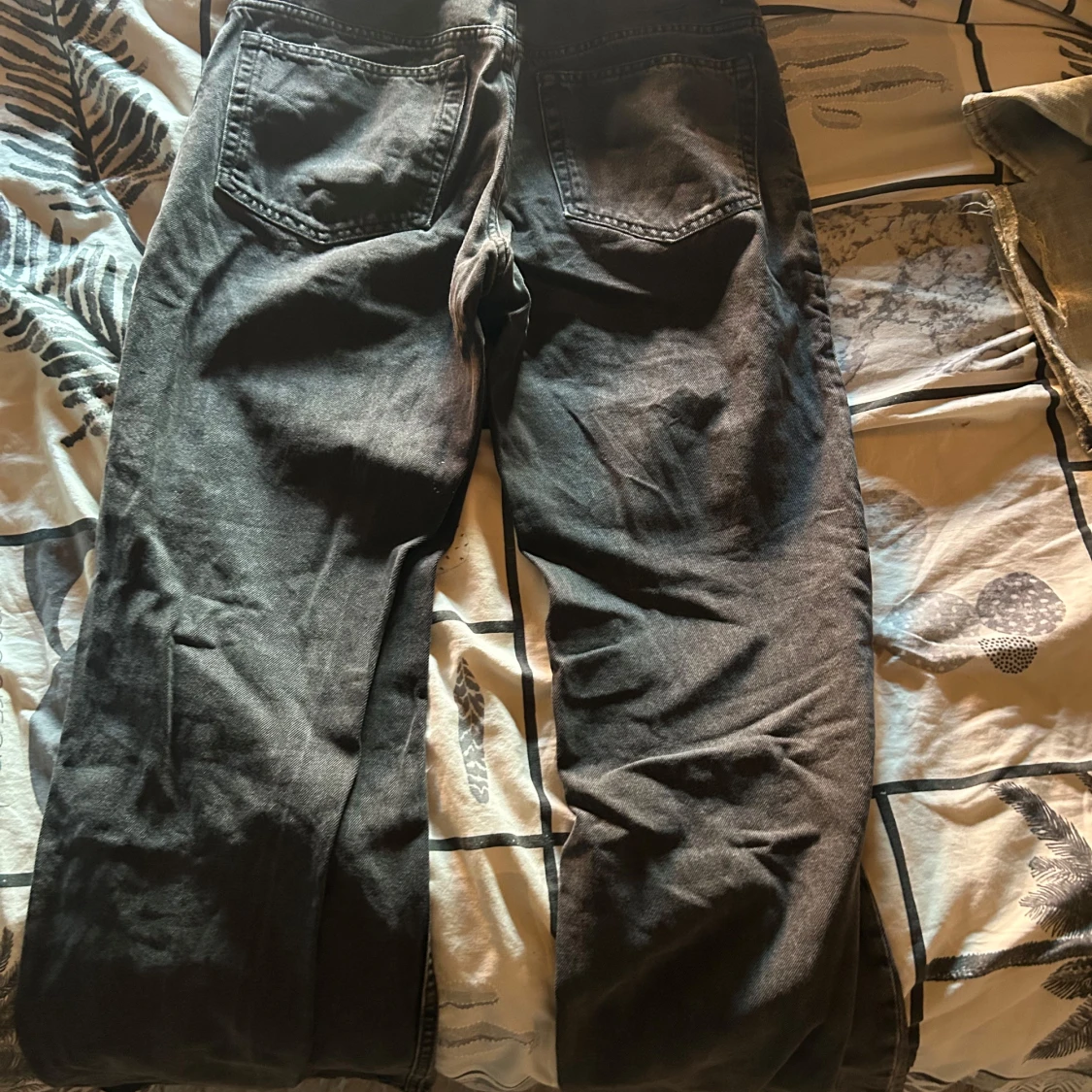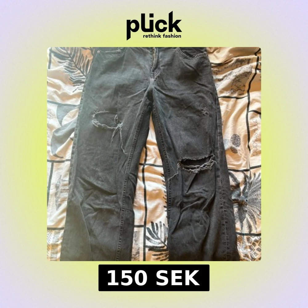 Säljer ett par svarta jeans med raka ben och slitna detaljer på båda knäna. Jeansen har klassisk femficksdesign, dragkedja och knapp framtill. Perfekta för en avslappnad och edgy stil. Lågmidjade.