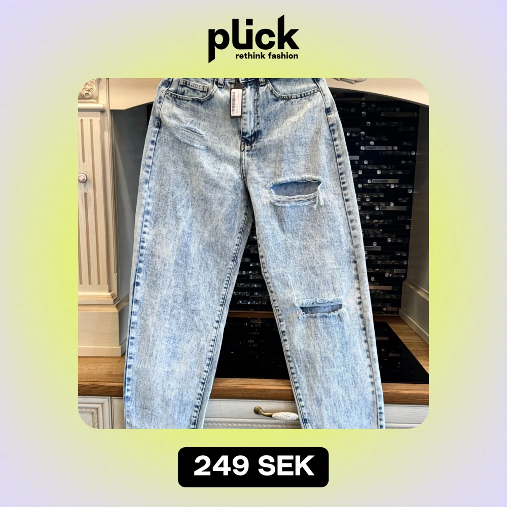 Säljer ett par ljusa jeans från PrettyLittleThing i nytt skick. De har en cool, sliten look med revor på framsidan och en hög midja. Perfekta för en avslappnad stil! 🕶️