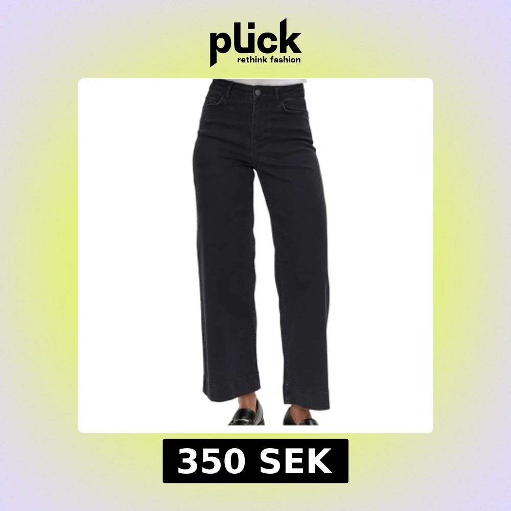 Snygga svarta jeans från Nümph med hög midja och raka, vida ben, cropped längd. Jeansen har klassiska fem fickor och bälteshällor. Materialet är mjukt och följsamt, 91% bomull 7% elastomultiester och 2% elastan.