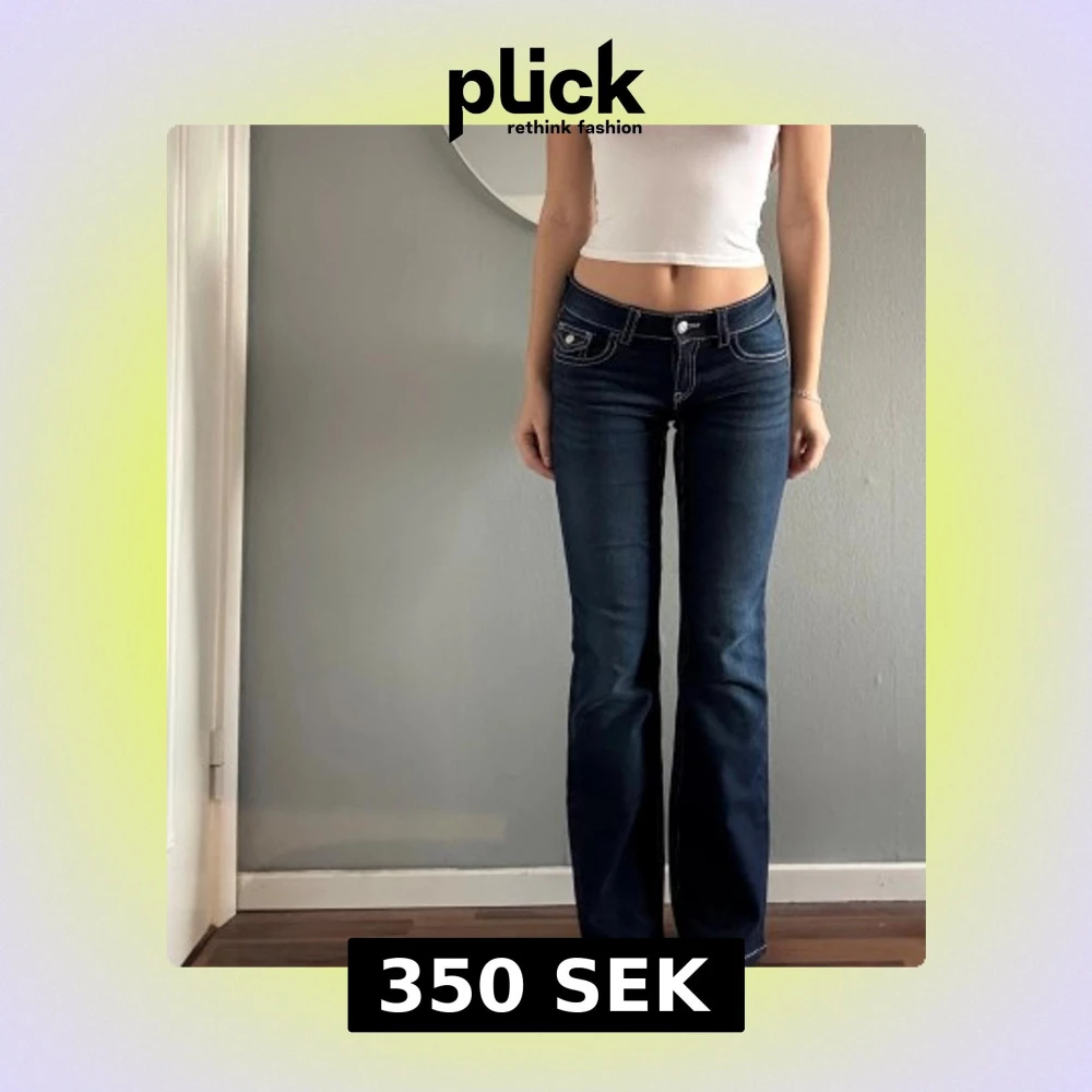 Säljer ett par mörkblå jeans med bootcut passform och vita kontrastsömmar. Byxorna har låg midja och är i superfint skick🥰