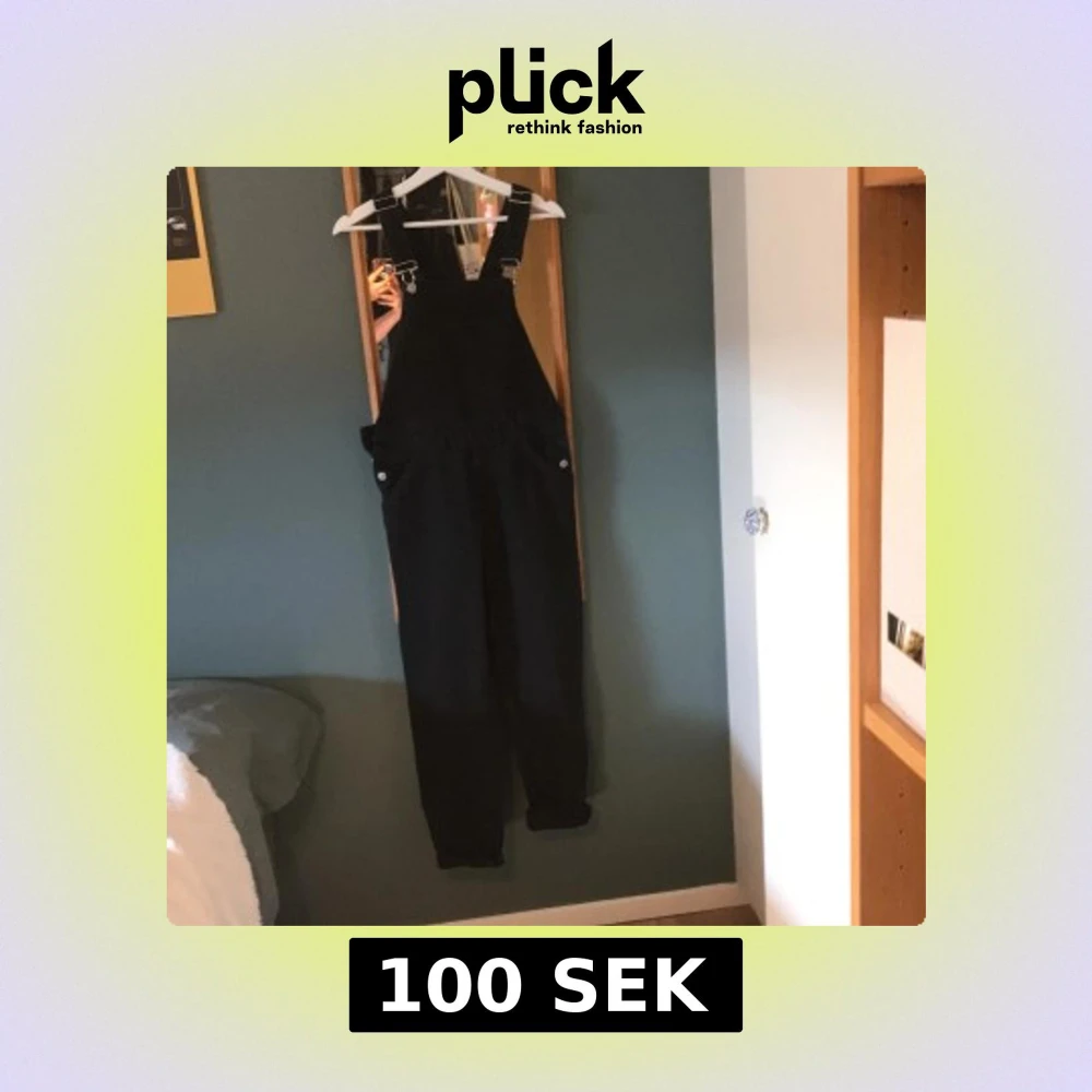 Svarta hängselbyxor med klassisk design och raka ben. Byxorna har stora fickor framtill och justerbara axelband med metallspännen. Perfekta att styla med en t-shirt eller tröja under.
