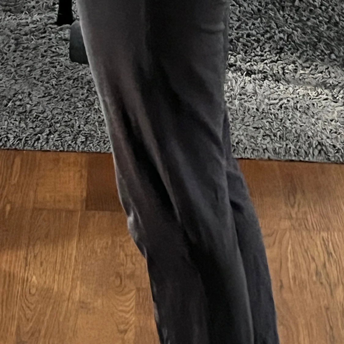 Säljer ett par svarta byxor med wide passform som sitter skönt och har raka ben. Materialet är mjukt och känns som bomull, perfekt för dig som gillar en avslappnad stil. Byxorna har en klassisk look och passar till många olika outfits.