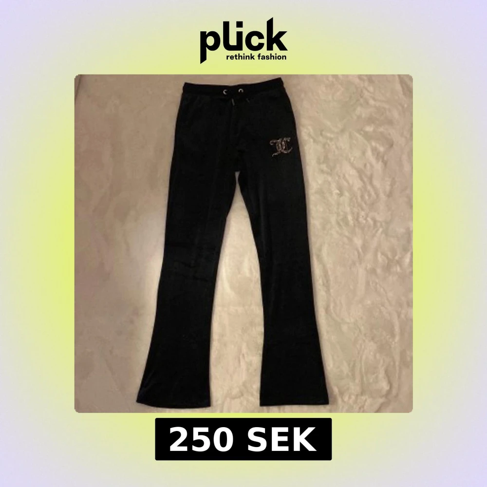 Snygga marinblåa byxor med en glittrig strassdetalj på ena benet. Byxorna har en bekväm passform med fickor baktill, framtill och dragsko i midjan. Perfekta för en stilren look. Medelhög midja. Mycket bra skick!💕