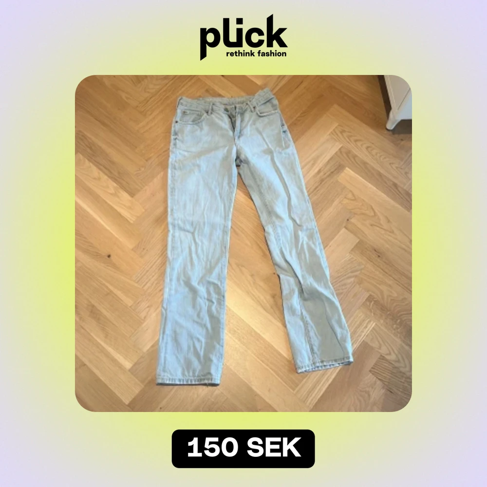 Ljusblåa jeans som är raka i benen och lågmidjade