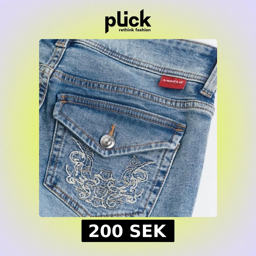 Snygga blå jeans från Angelic med unika broderade detaljer på bakfickorna. De har en klassisk femficksdesign och en knappstängning. Perfekta för en stilren look. Hör av er för fler bilder på. Säljer pga för stora därav lånade bilder för rättvisare resultat.