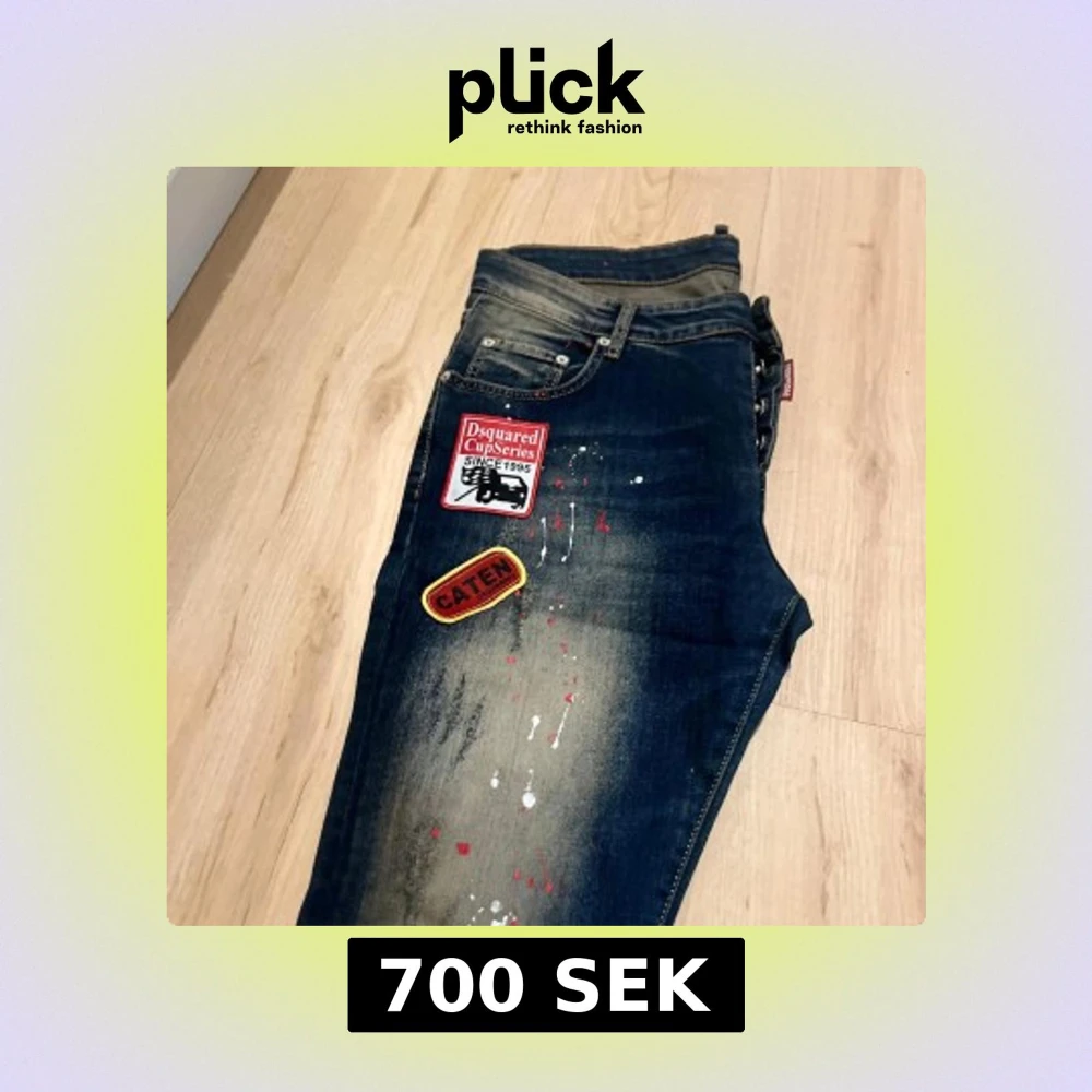 Mörkblå jeans från Dsquared2 med coola patchar på framsidan och färgstänk i rött, vitt och gult. Jeansen har klassisk femficksdesign, slitna detaljer och Dsquared2-logga bak. Snygg streetstil med unik look.