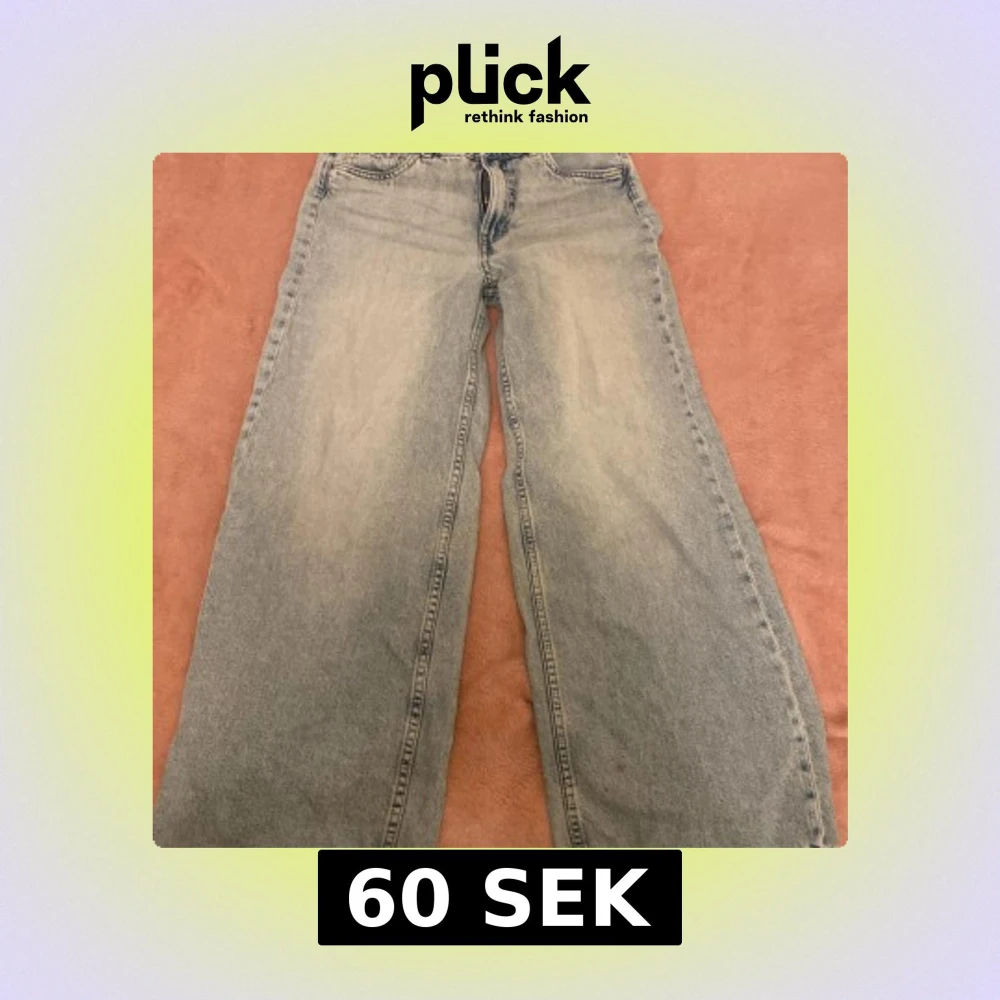 Säljer ett par ljusblå jeans med breda, raka ben och klassisk femficksdesign. Jeansen har en avslappnad passform och är tillverkade i denim med dragkedja och knapp framtill. Perfekt för dig som gillar loose och wide stil. Jag har också tappat lite nagellack på dem