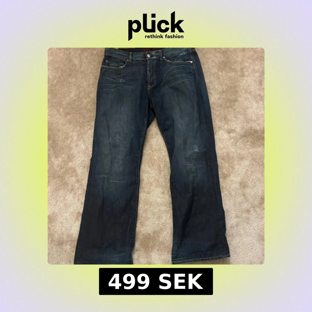 Mörkblåa ben sherman jeans som är lite mer åt baggy hållet. Bra skick med snygga slitningar. Mått finns på bilderna även bild på hur dem sitter på mig (186cm). Mycket snygga jeans! Hör av er vid funderingar 😁