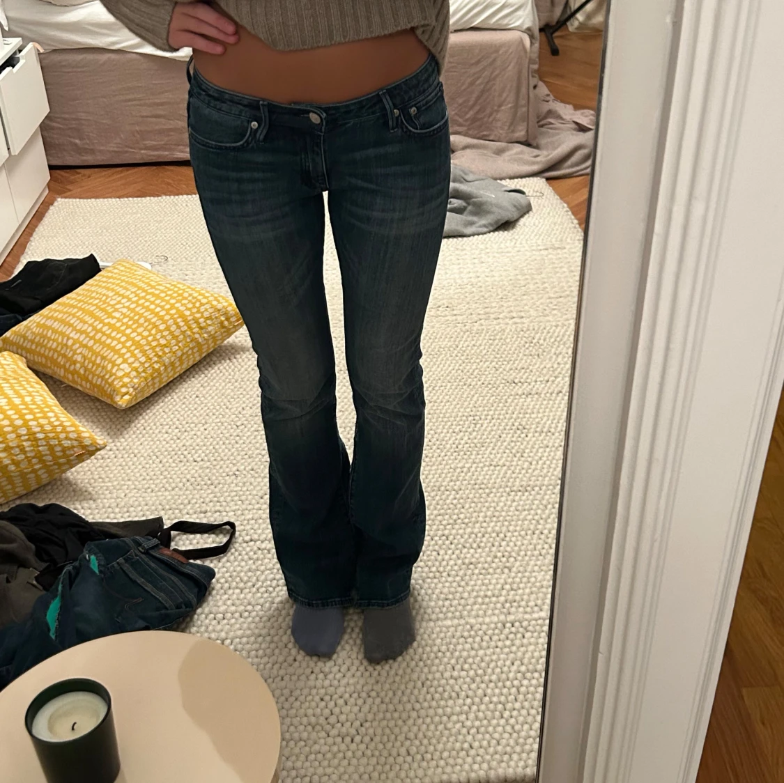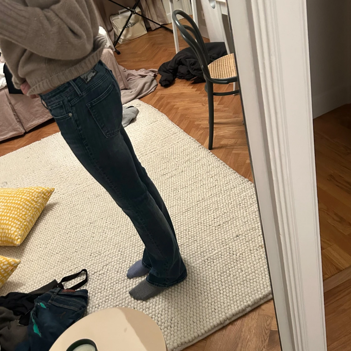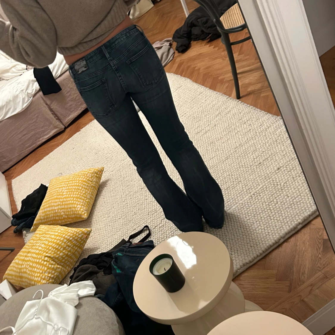 Snygga mörkblå bootcut jeans med låg midja. Perfekta för en avslappnad stil. Klassisk femficksdesign och knappgylf.