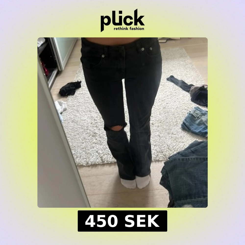 Säljer ett par svarta jeans med bootcut-modell och ett snyggt hål på ena knät. Jeansen har klassisk femficksdesign och är i denimtyg som sitter skönt. Perfekta om du gillar en lite edgy stil och vill ha något som sticker ut.