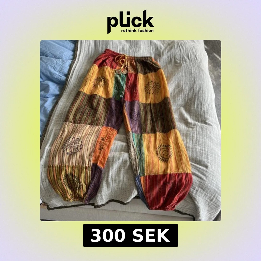 Säljer ett par färgglada byxor i 100% bomull, tillverkade i Nepal. Byxorna har ett patchwork-mönster i olika färger som röd, grön, orange och blå. De har en elastisk midja med snörning och unika tryckdetaljer.