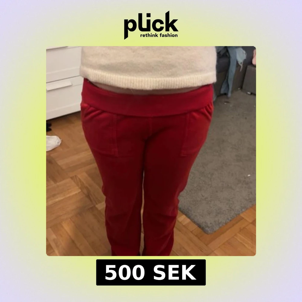 Röda juicy byxor i färgen Astor red. Kommer inte till användning längre. Storlek s. Saknar metalbitarna på båda snörena men funkar fortfarande bra att använda och fortfarande lika snygga