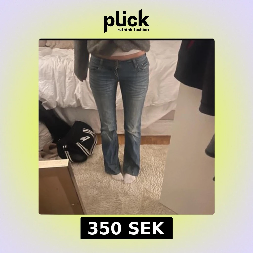 Säljer ett par snygga blå bootcut jeans med låg midja. Innerbenslängd - 80cm. Midjemått - 39cm.