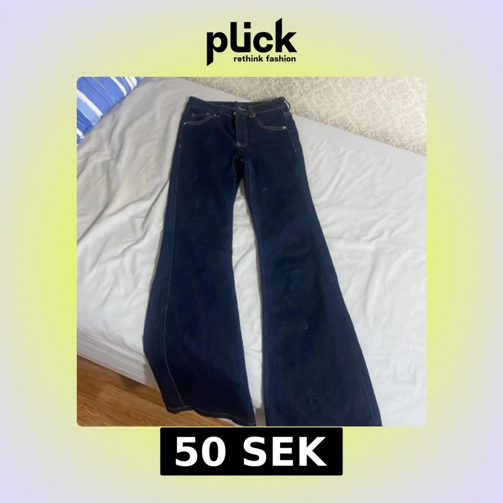 Säljer ett par mörkblå jeans med bootcut passform och kontrastsömmaruu. Klassisk femficksmodell med knapp och dragkedja framtill. Perfekta för dig som gillar en retroinspirerad stil.