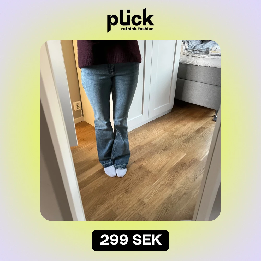 Säljer ett par snygga blå bootcut jeans i nästan nyskick. Dom är lågmidjade och från gina. Jeansen har en bekväm och snygg passform💕