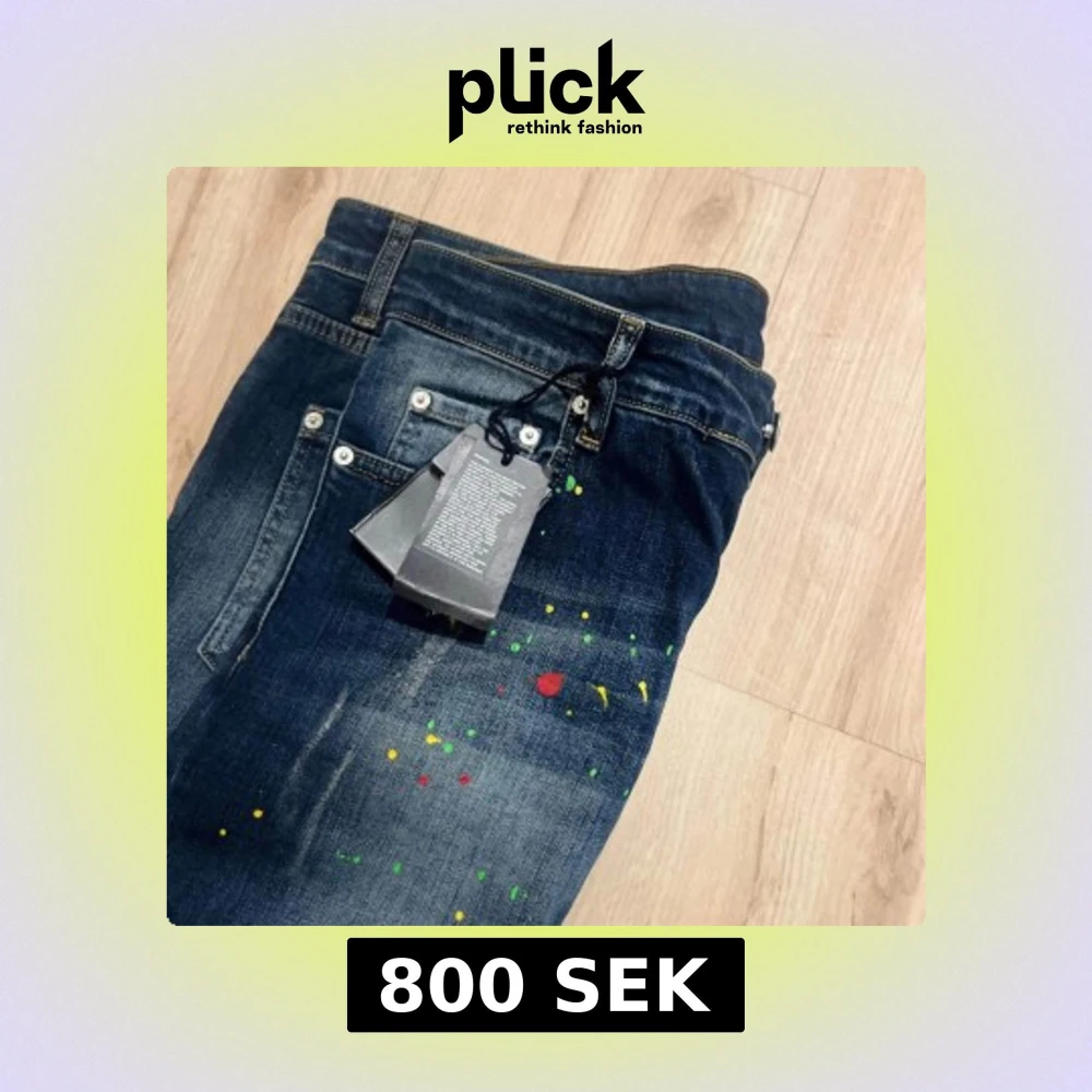Mörkblå jeans från Dsquared2 med coola färgstänk i gult, grönt och rött. Klassisk femficksmodell med slitningar och en grön Dsquared2-patch bak. Jeansen har en rak passform och är tillverkade i bomullsdenim.