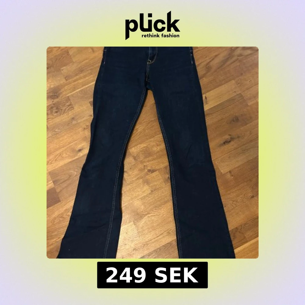Säljer ett par mörkblå jeans med bootcut passform och medelhög midja. Skriv vid funderin om passform!