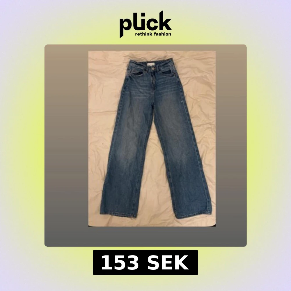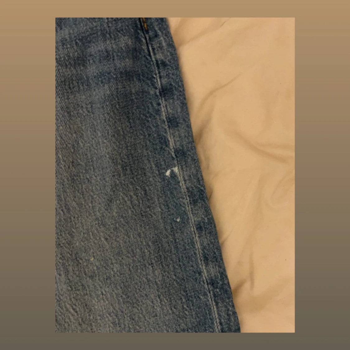 Säljer ett par klassiska blå jeans storlek 164. Byxorna är i bra skick och har en avslappnad passform som passar till många olika outfits. Med lite vitt nagellack på sidan av benet.