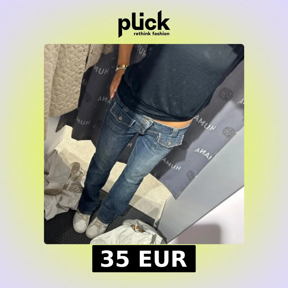 Snygga blå jeans med låg midja och bootcut-stil. De har en klassisk femficksdesign med knappar och dragkedja framtill. 💝💝