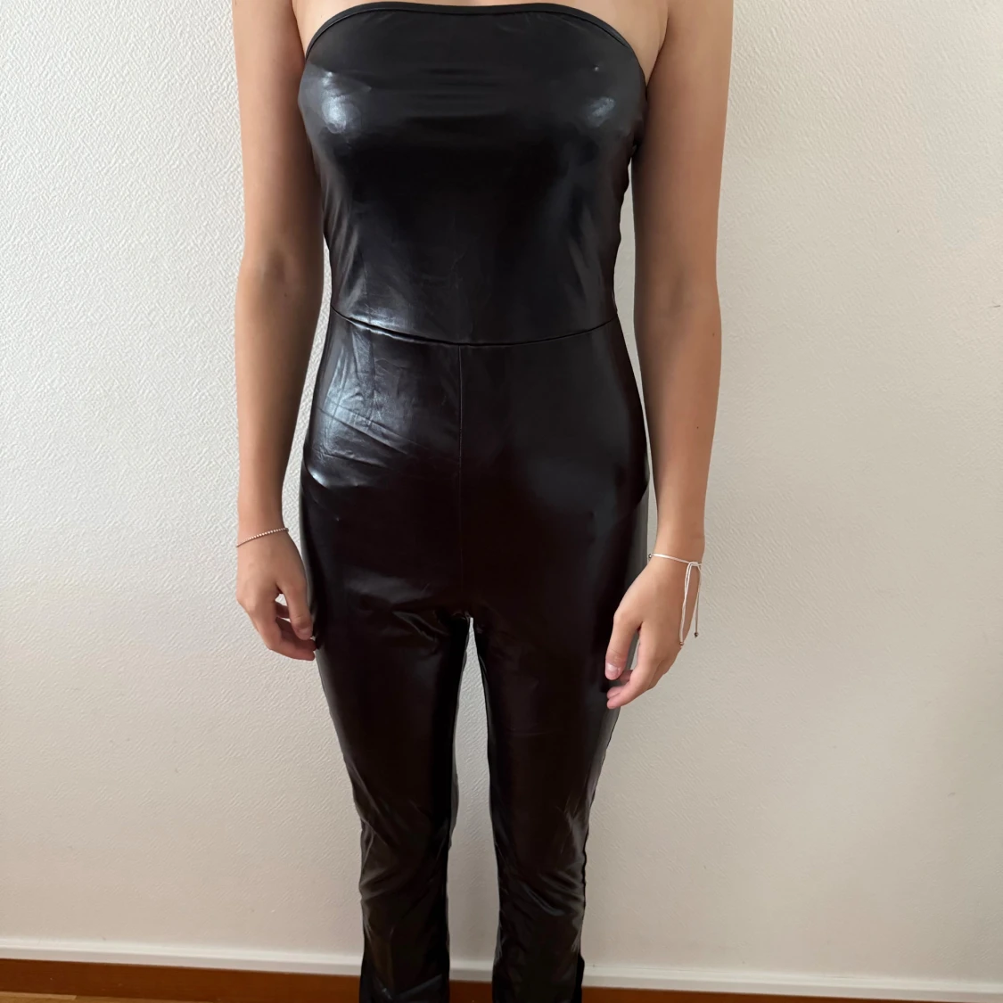Säljer en svart byxdress med tubtoppskärning i glansig skinnimitation. Tight passform som sitter snyggt och markerar figuren. Perfekt för dig som vill sticka ut med en edgy och trendig look.