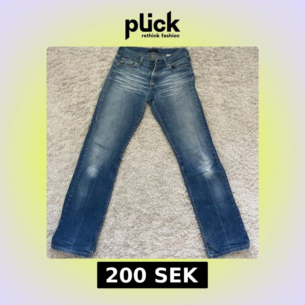 Säljer ett par vintage blå jeansbyxor från Bikk Bok med normal passform. Byxorna har fem fickor, dragkedja och knapp framtill samt snygga slitningar och ljusare partier på låren för en trendig look. Sitter som en storlek 36