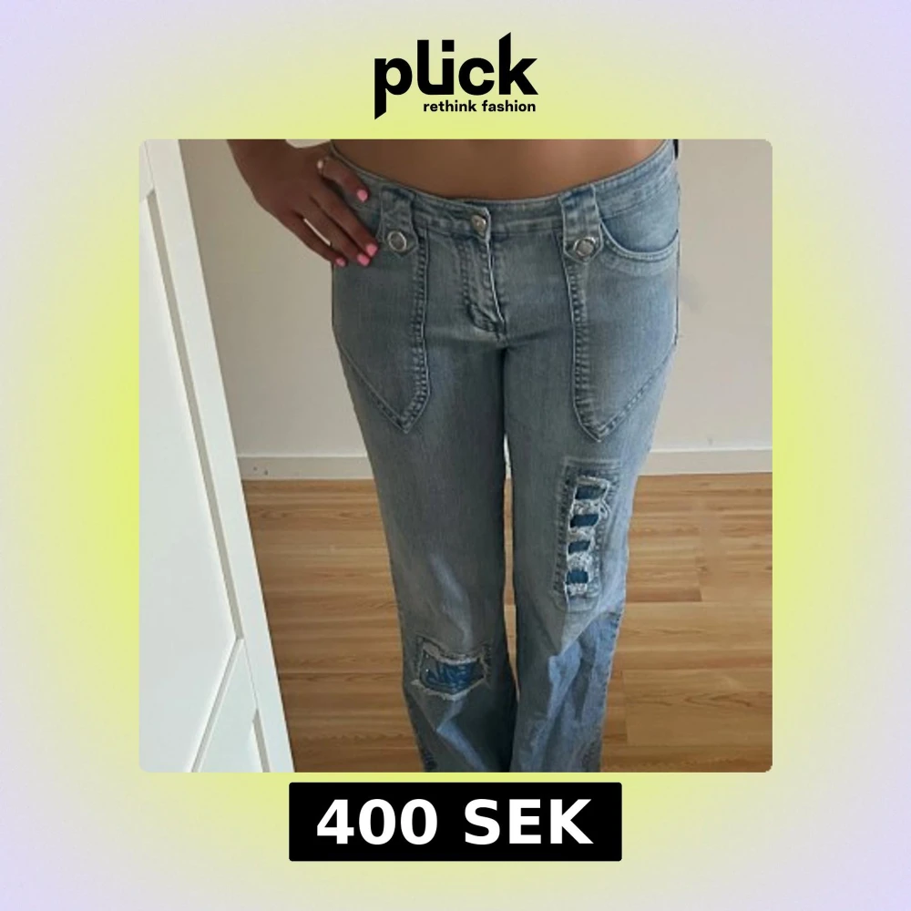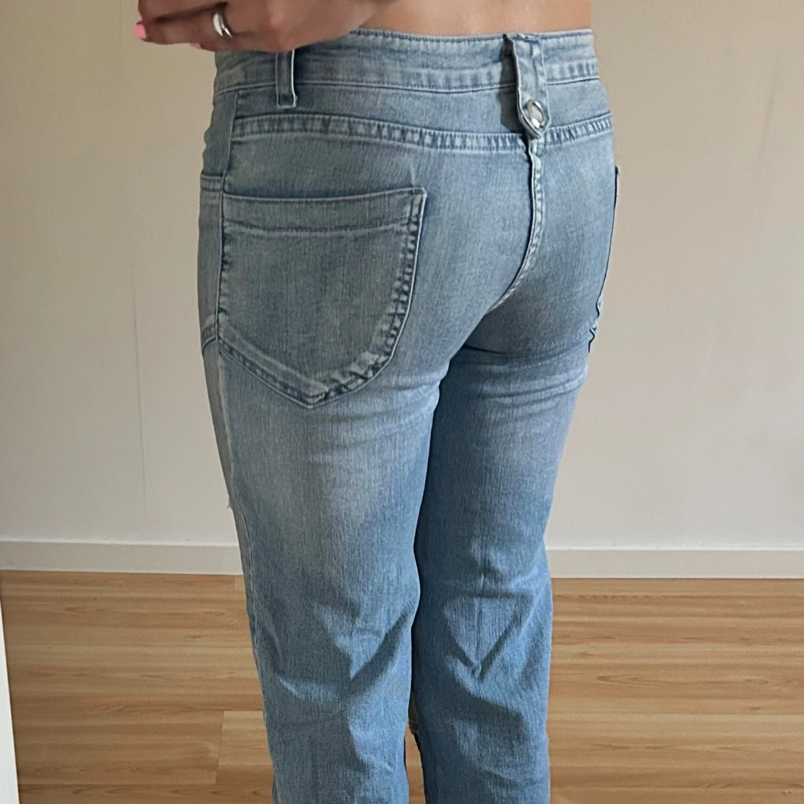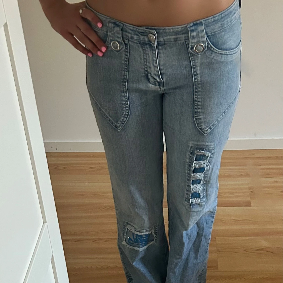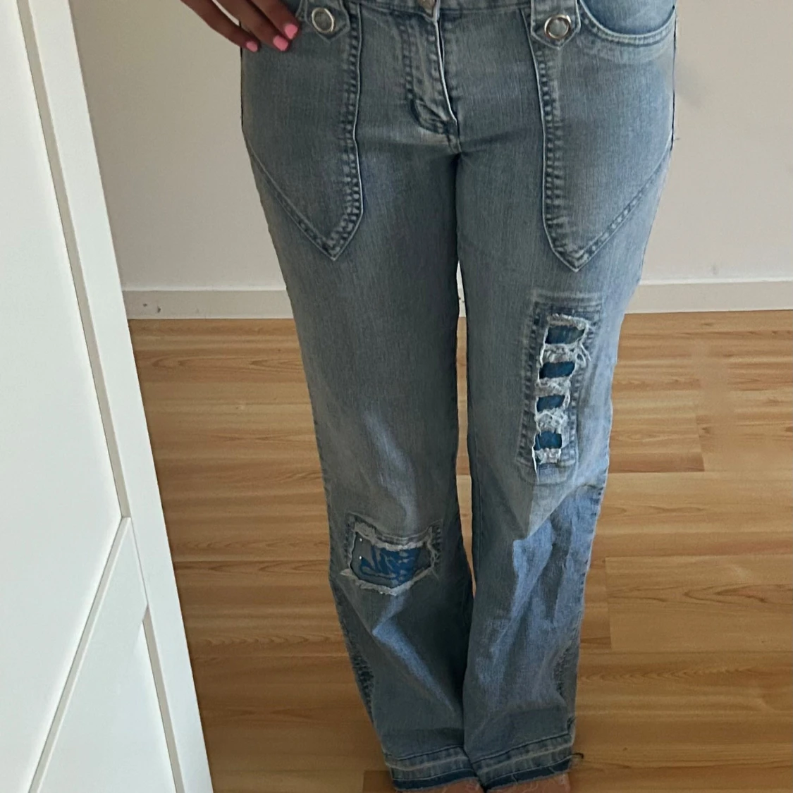 Säljer ett par ljusblå jeans med raka ben och coola patchade detaljer på låret och knät. Byxorna har stora fickor fram med silverringar och klassiska bakfickor. Snygg streetstil och perfekt för dig som gillar unika jeans.