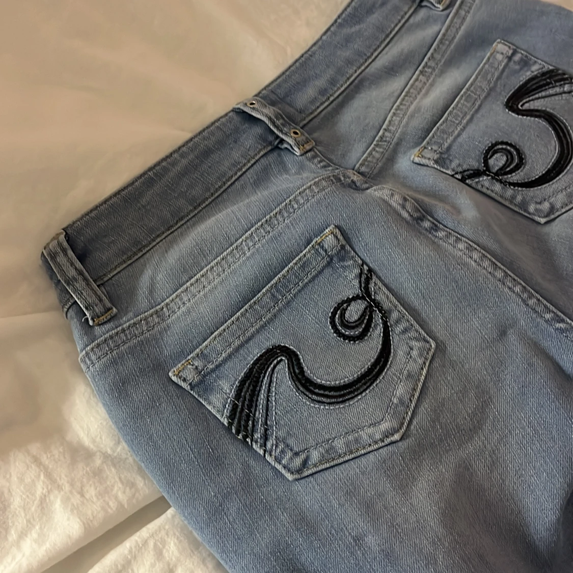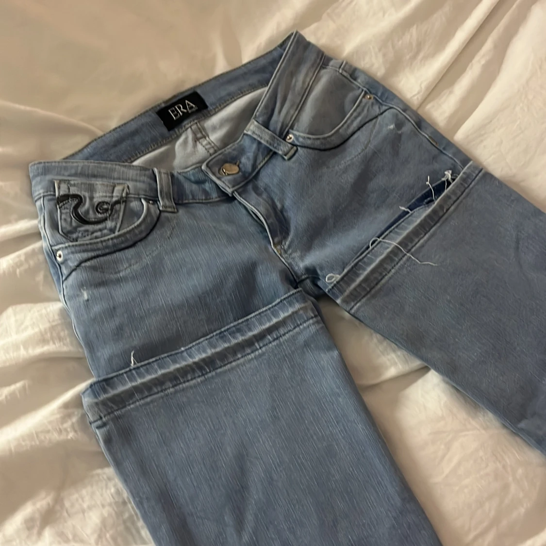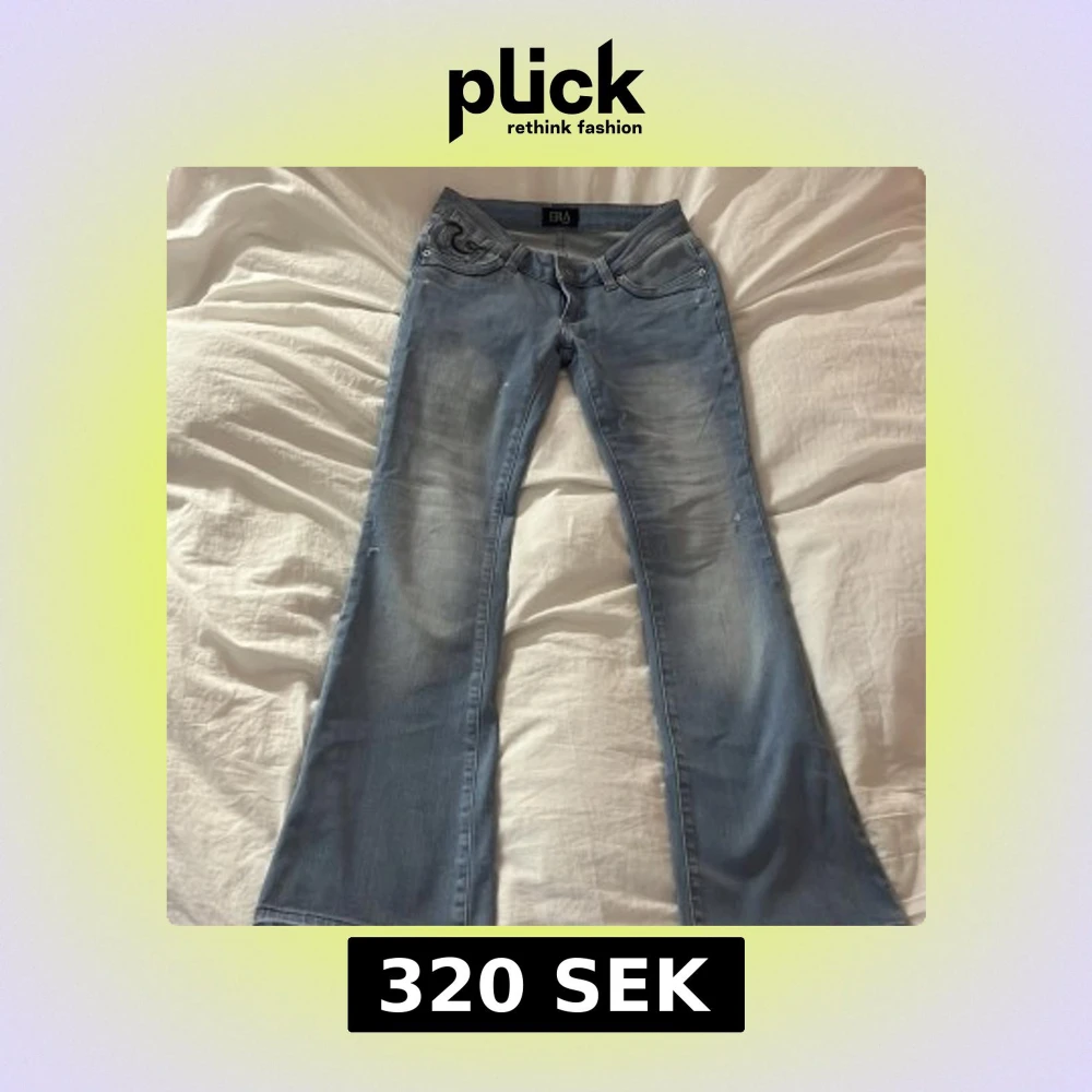 Säljer ett par ljusblå bootcut jeans från ERA med snygga svarta broderier på bakfickorna. Jeansen har klassisk femficksdesign, låg midja och är tillverkade i mjukt denimtyg. Köpta på Plick men säljer då de inte passade mig, skriv för fler bilder eller funderingar 💕