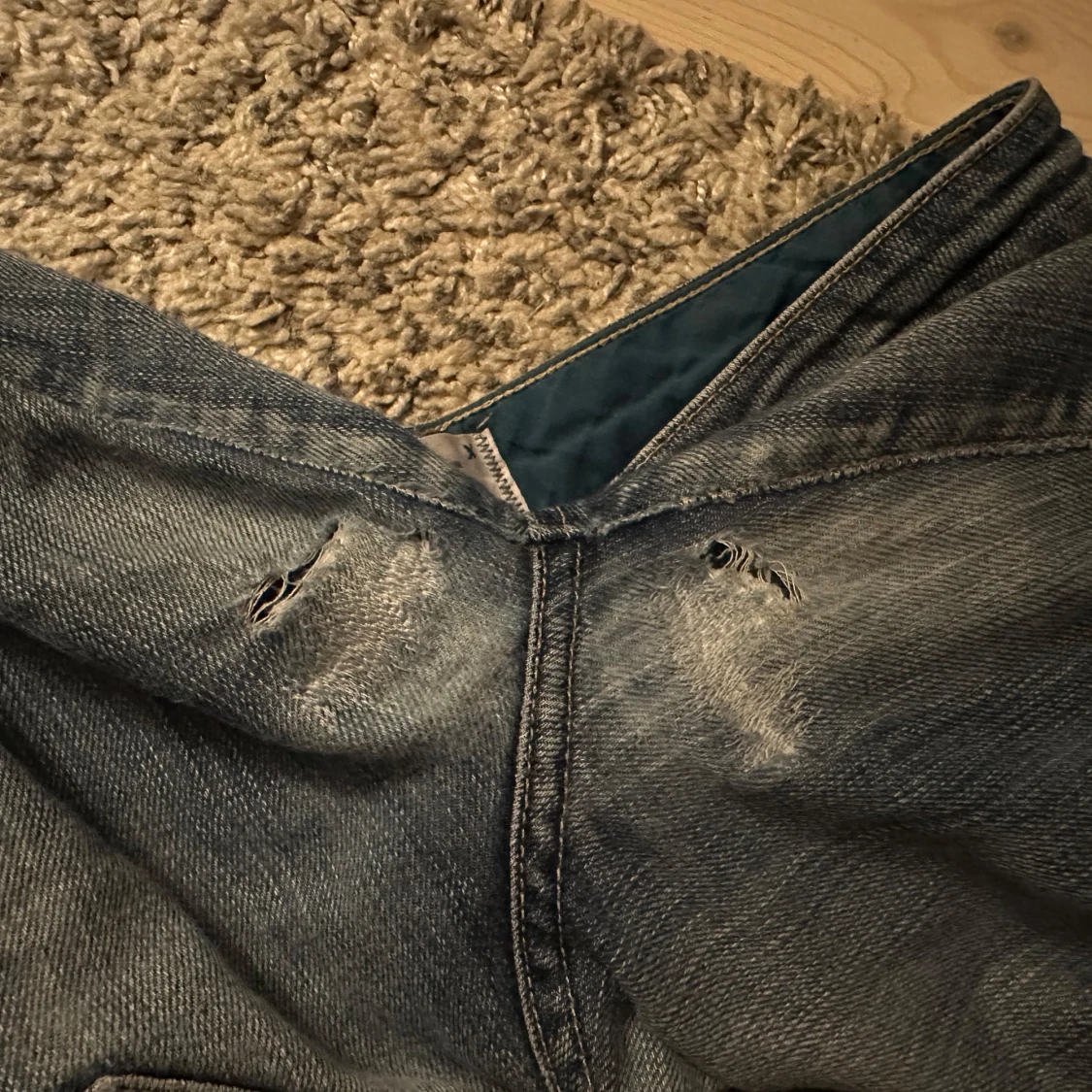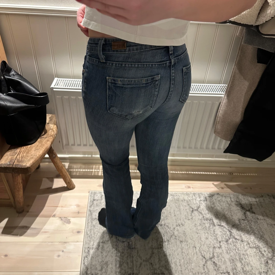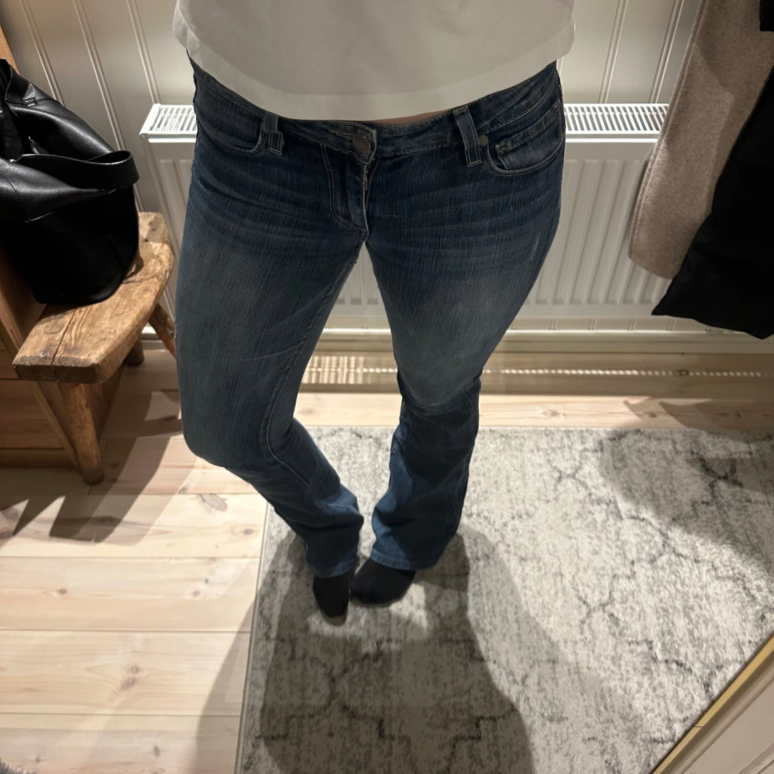 Säljer ett par klassiska blå jeans med bootcut. De har en snygg tvätt och är perfekta för en avslappnad stil. Jeansen har en låg midja och är tillverkade i denim. Finns hål i skrevet och har tidigare lagat dem där så det är bara att göra det igen har bara inte haft tiden själv! Syns annars inte om du väljer att inte sy dem!