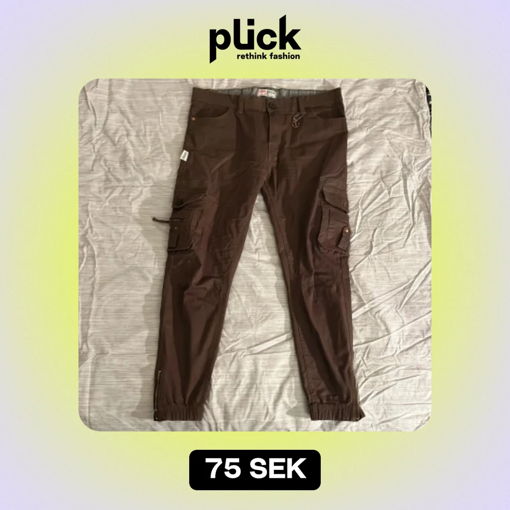 Bruna cargopants, med fickor som stängs av knappar. Liten sjödetalj också, som syns på bild. Väldigt bekväma.