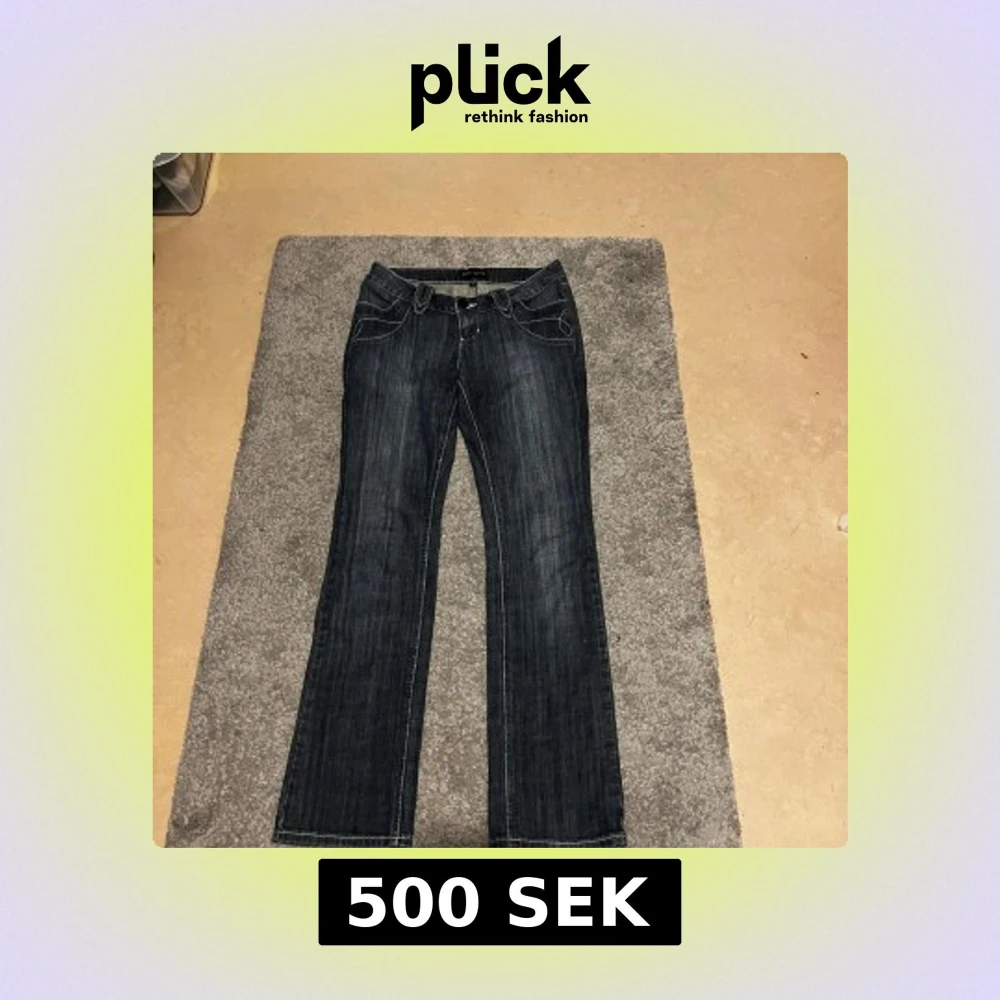 Mörkblå jeansbyxor med vita kontrastsömmar och snygga detaljer på bakfickorna, bland annat dragkedja. Klassisk femficksmodell med bootcut passform och låg midja. Storleken 36/38