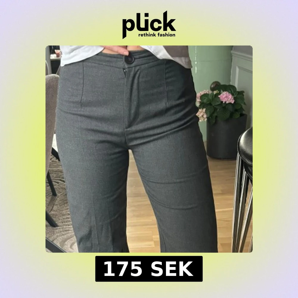 Snygga grå kostymbyxor med normal/ tajt pasform upptill och med vida ben. Byxorna har hög midja och är ganska långa i benen. Jag e 167cm och dom går ner ungefär till hälen. Använd några gånger men inga märken. Dom är ifrån Berska.