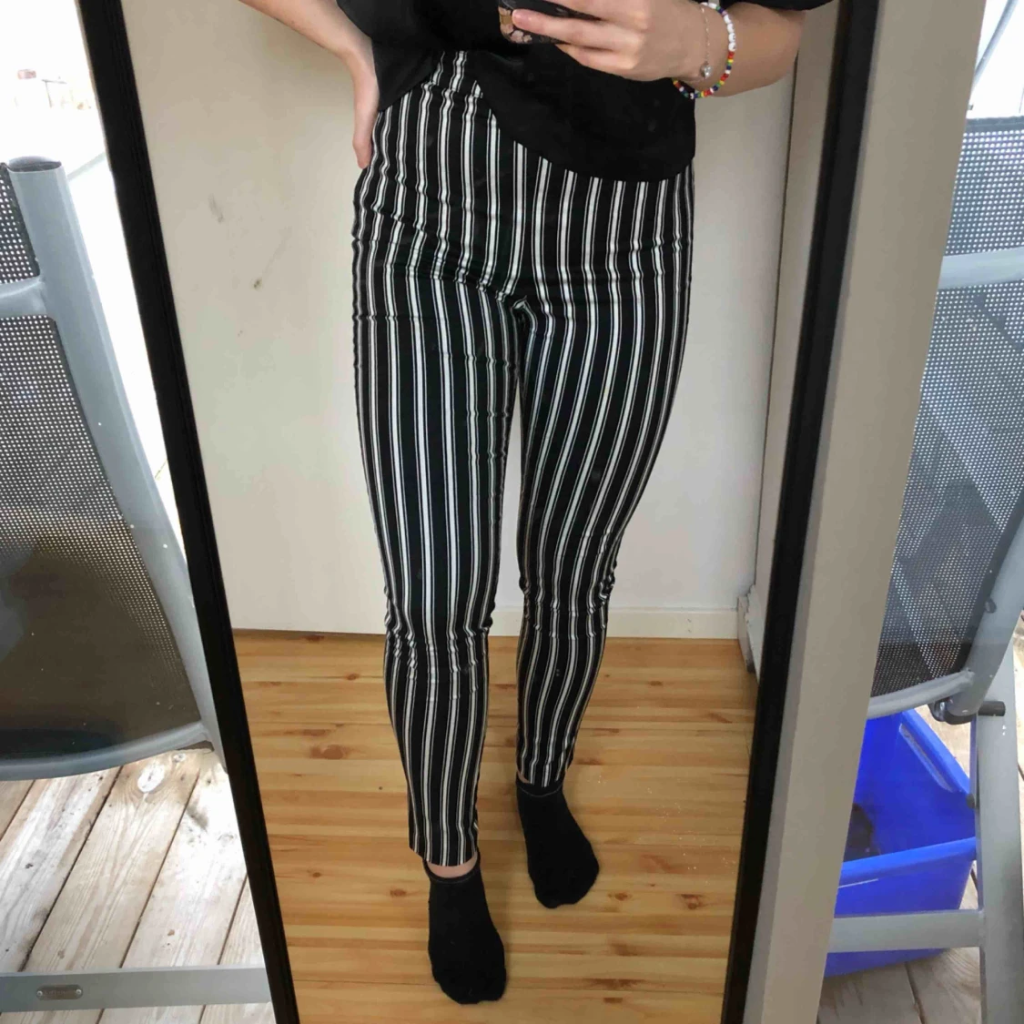 Randiga byxor från H&M, storlek 36. Smickrande byxor i skönt stretchigt material. Endast använda en gång då det inte riktigt är min stil. Frakt ingår i priset 🌸