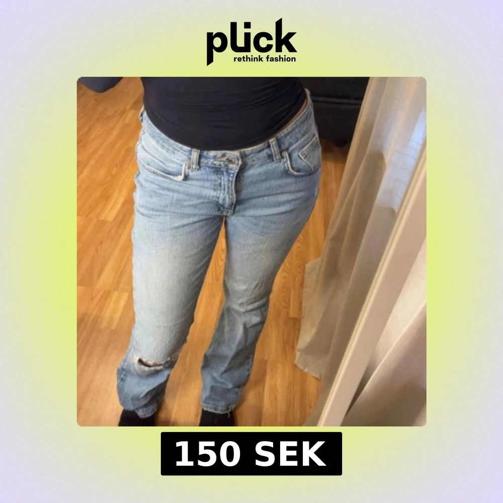 Säljer ett par ljusblå jeans med rak passform och klassisk femficksdesign. Jeansen har en snygg sliten detalj med hål på ena knät och är tillverkade i jeansmaterial. Perfekt för dig som gillar en avslappnad och trendig stil.