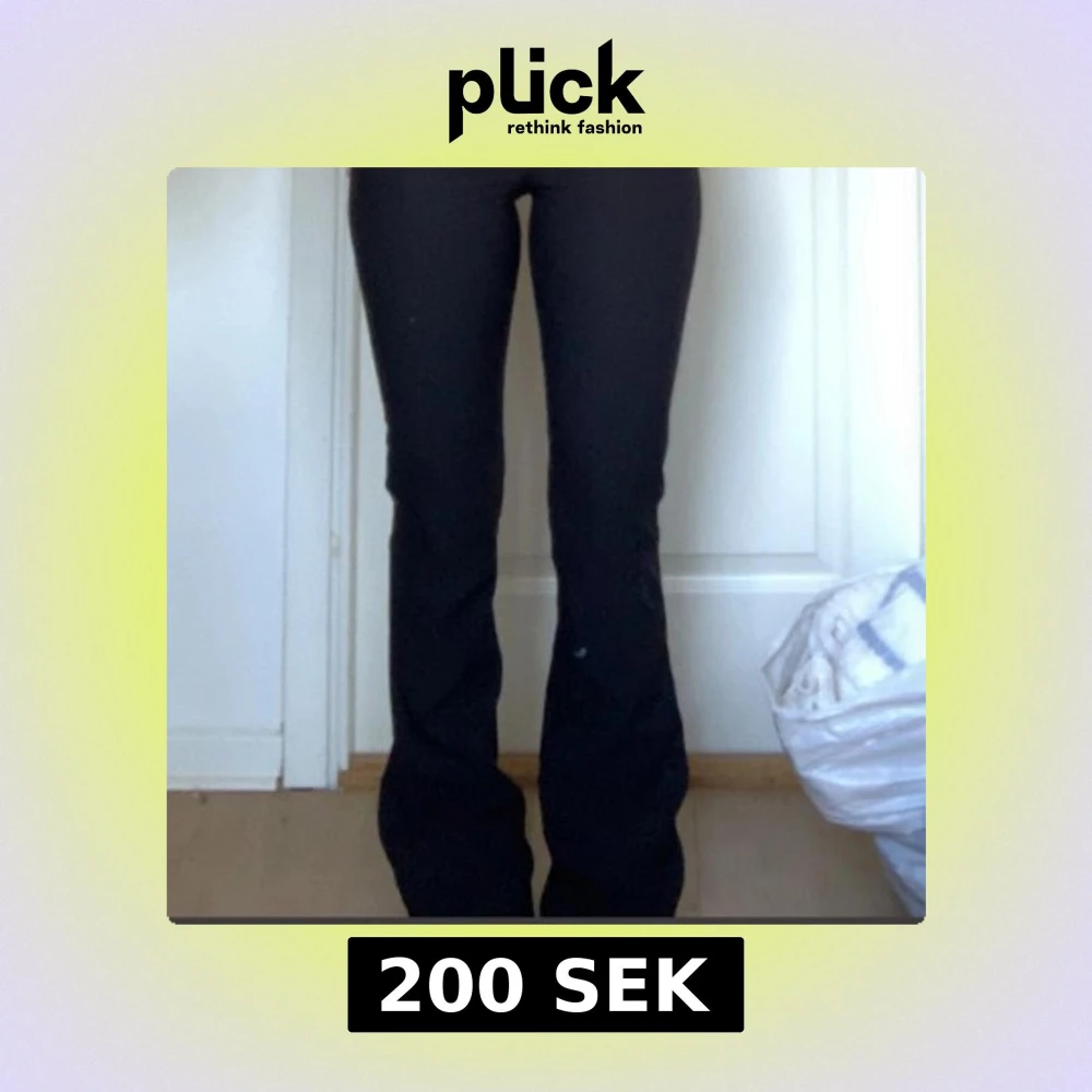 Säljer ett par svarta kostymbyxor med bootcut-snitt med låg midja. Då byxkanten är tjockare så ser det ut som låg midwaist. Byxorna har två knappar fram, fickor med lock och knapp bak samt är sydda i ett mjukt tyg. Säljer enbart pga att de är för långa för min längd. Om du vill ha flera bilder eller har någon fråga så är det bara att skicka iväg ett meddelande 💕