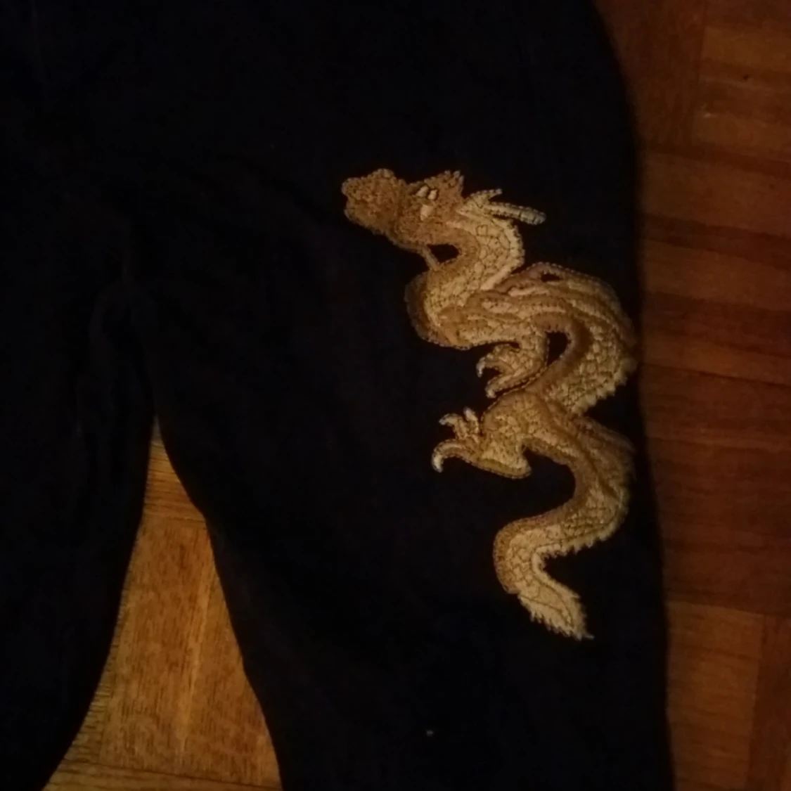 Svarta jeans med mode-slitningar och drakbroderi. 50kr. Stl 36.