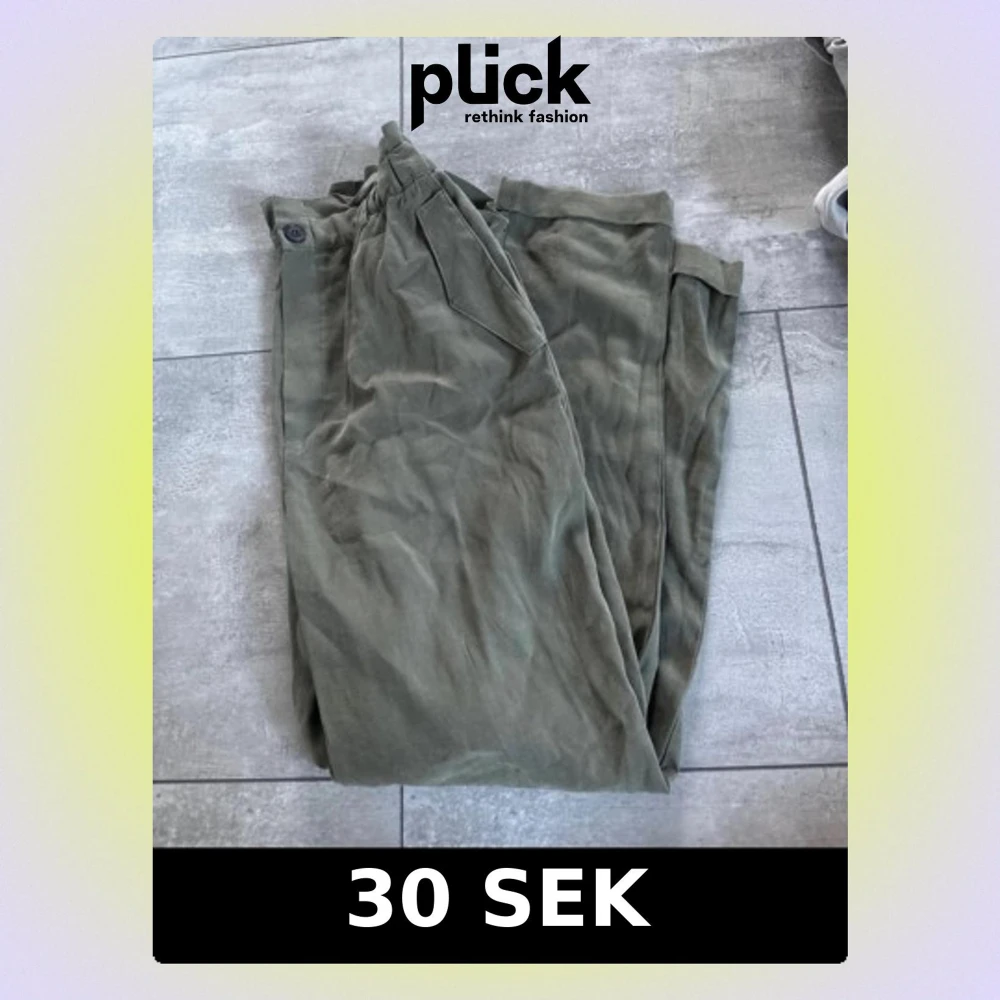 Säljer ett par olivgröna cargopants med klassiska sidofickor och knapp i midjan. Byxorna har en avslappnad passform och är perfekta för en chill och casual stil. Tillverkade i mjukt bomullsmaterial för extra komfort.