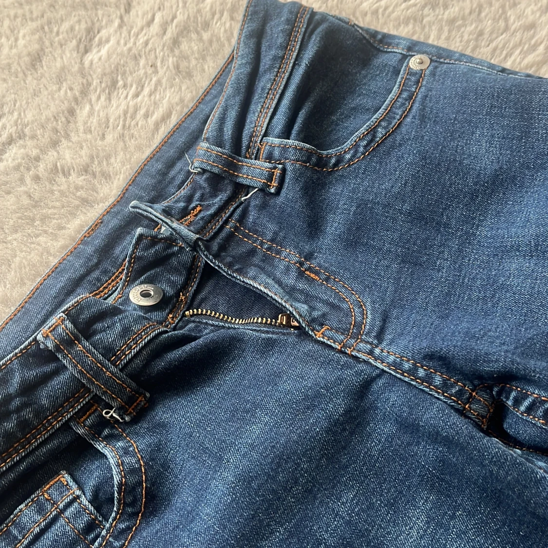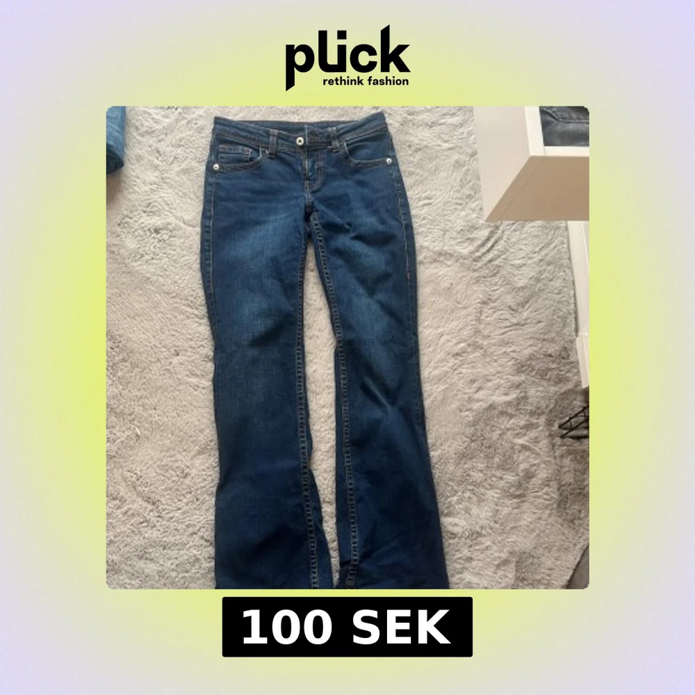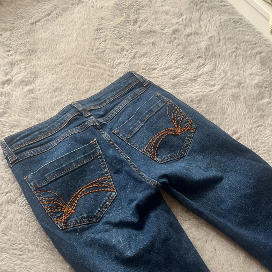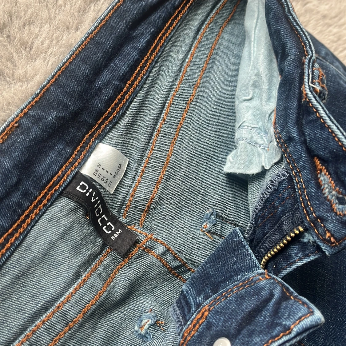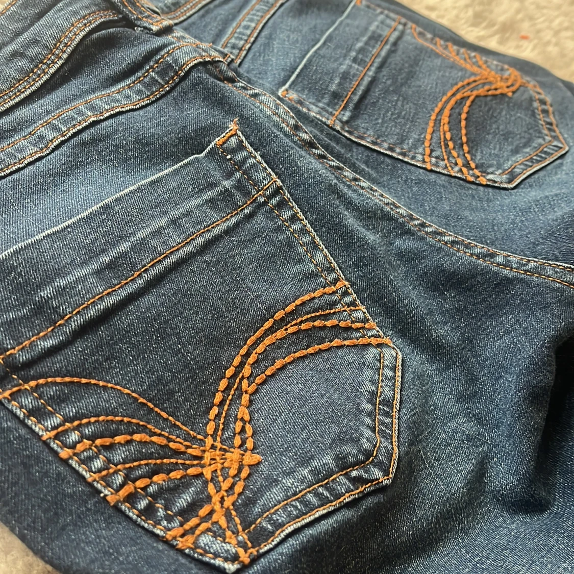 Snygga blå bootcut jeans från Divided H&M med klassisk femficksdesign och coola broderade detaljer på bakfickorna. Jeansen har orange kontrastsömmar och dragkedja framtill. Perfekta för dig som gillar en avslappnad men trendig look.