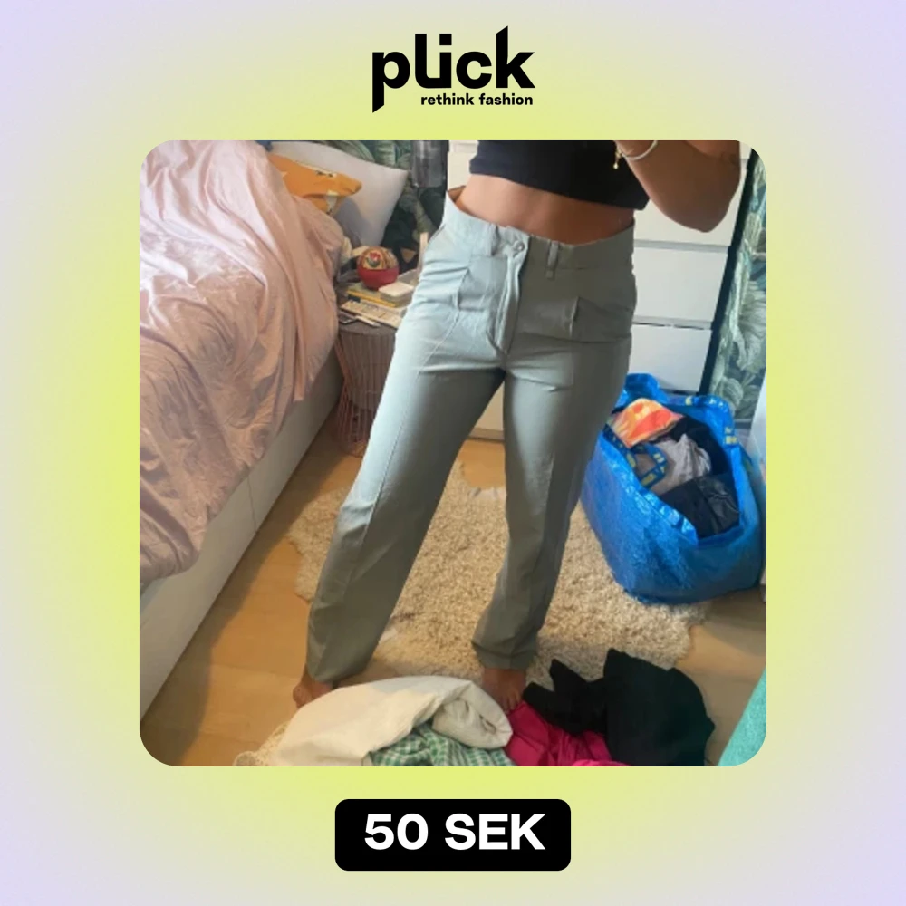 Jättesköna kostymbyxor som är gröna. Bra längd i benen för mig som är ca 168. Lite stora i midjan, brukar vika ner ett snap i midjan eller ha skärp och då blir dem toppen.De har lite rosa tonat frampå, försökte få med det på bild (5/5) står inte str