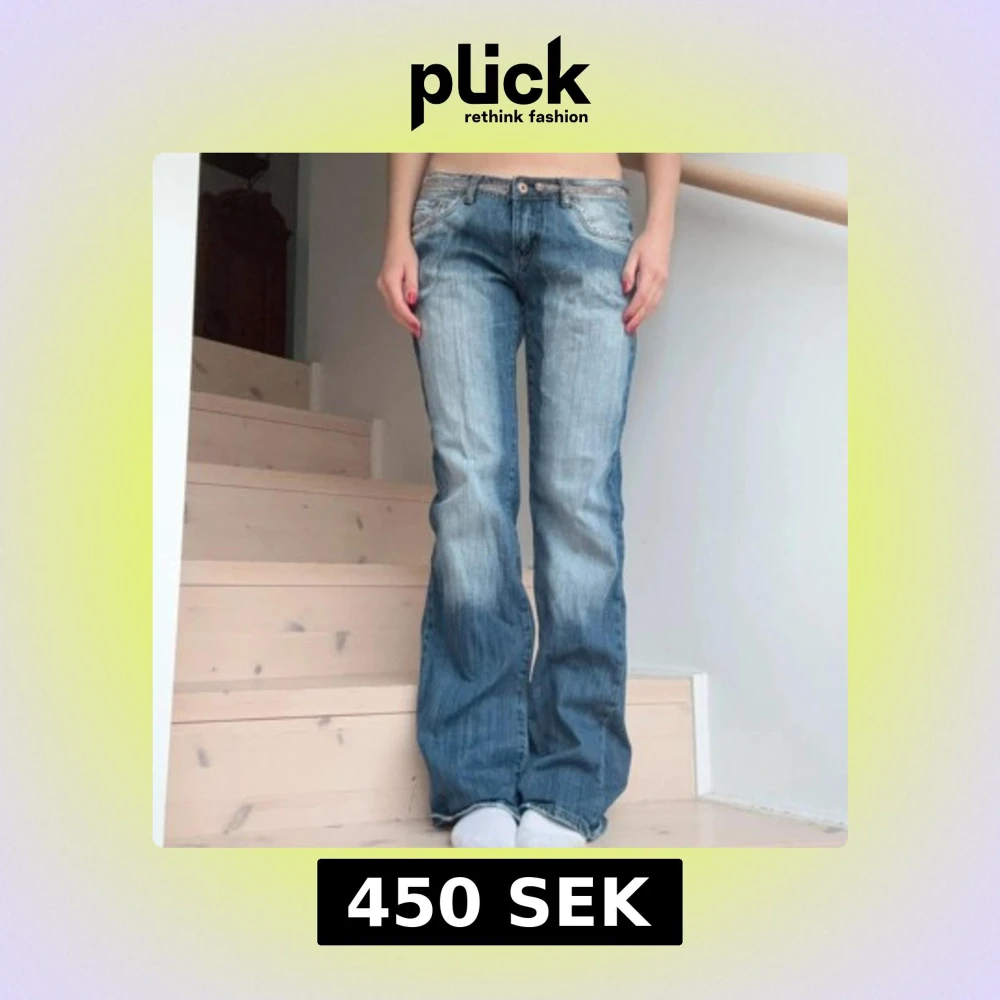 Snygga blå jeans med baggy-modell och urtvättade detaljer framtill och baktill. Jeansen har låg midja och klassiska fickor, samt dekorativa paljetter på bakfickorna. Perfekta för en avslappnad och trendig look. INTE MINA BILDER