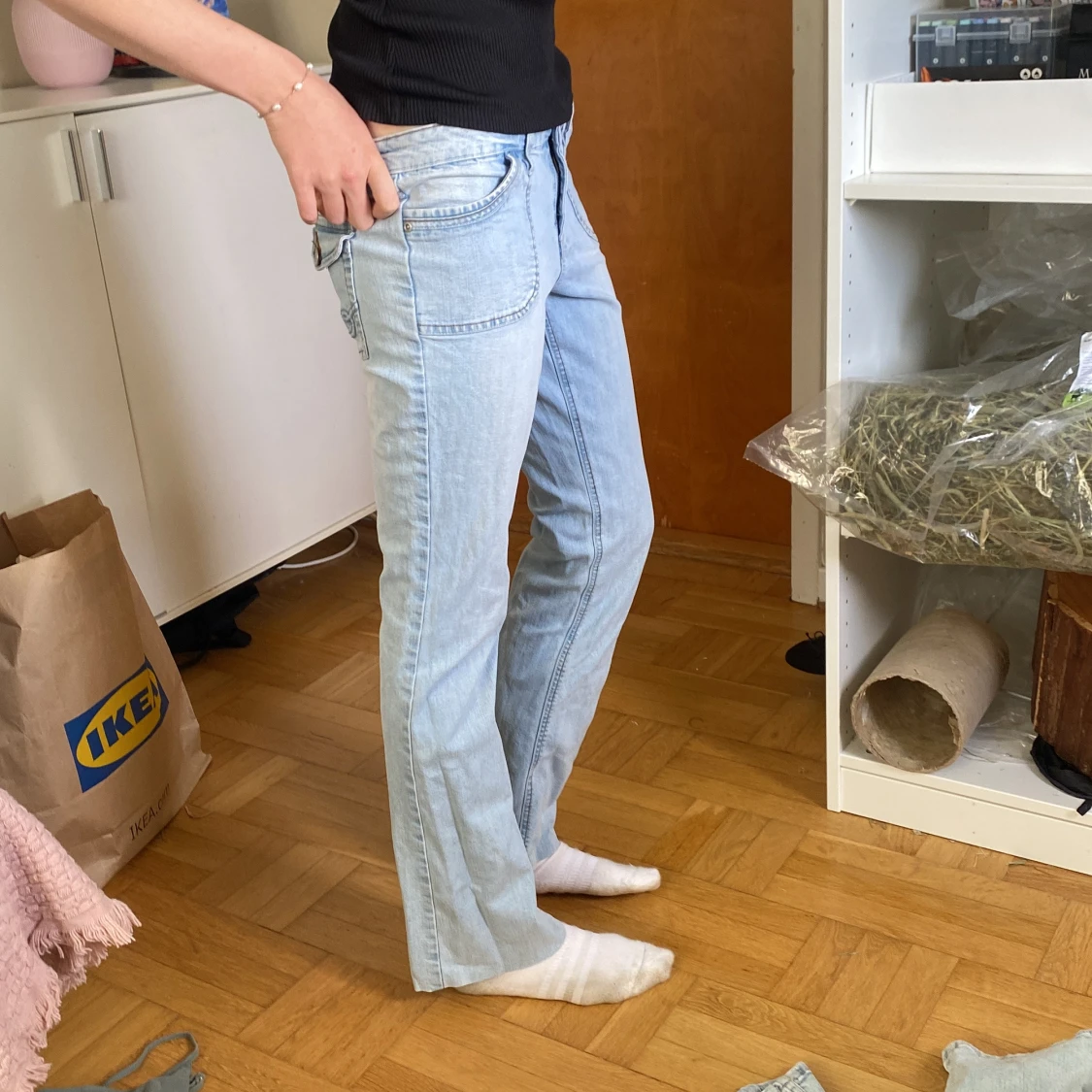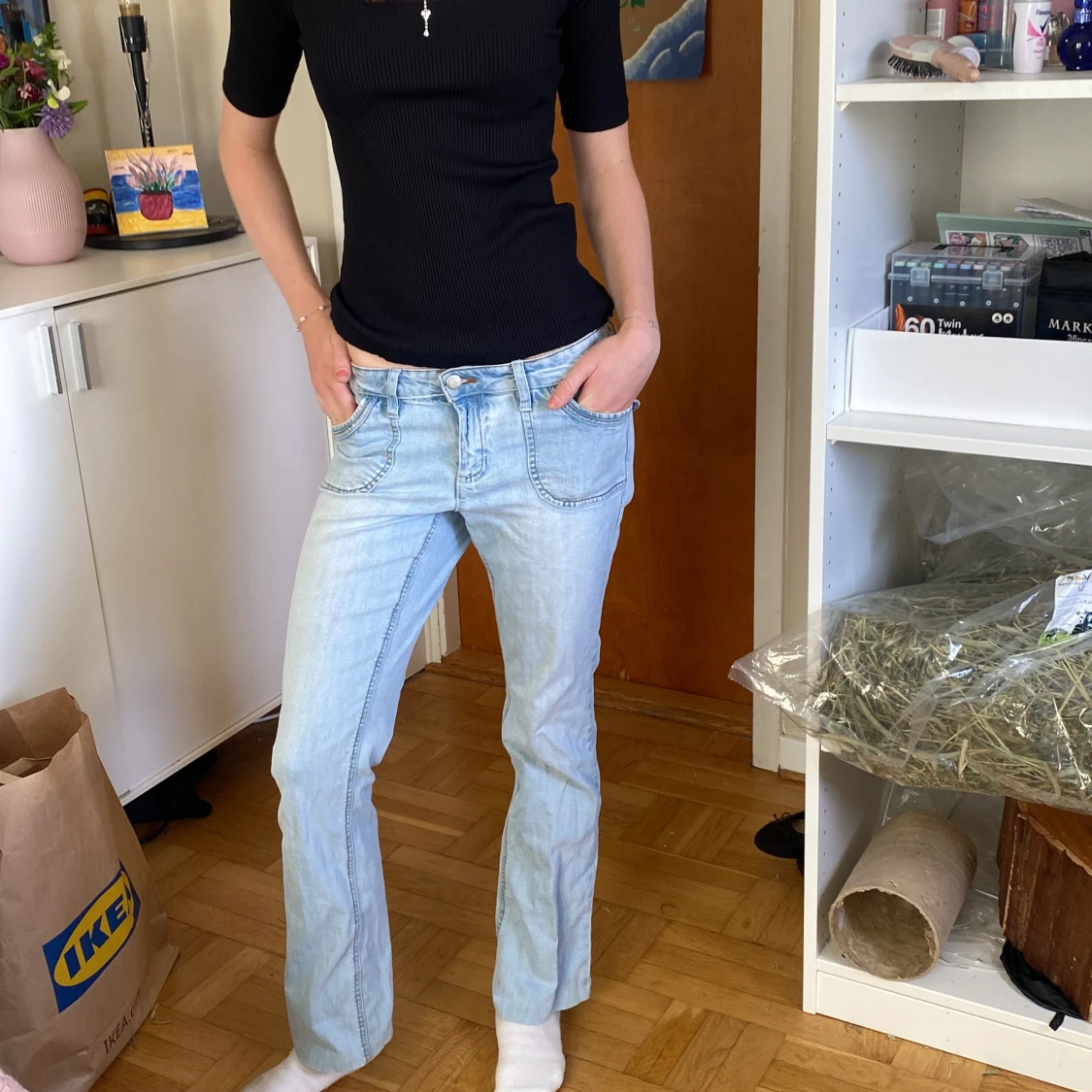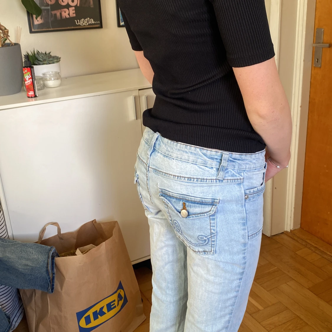 Personen på bilderna är 174 så det är lite korta därav att man inte ser bootcuten liks mycket! 💓Är 38 men känns som 36. Säljer ett par ljusblå jeans med bootcut passform och snygga fickdetaljer bak med knapp. Jeansen har låg midja och är tillverkade i klassiskt denimtyg. Perfekta för dig som gillar en avslappnad och trendig look.