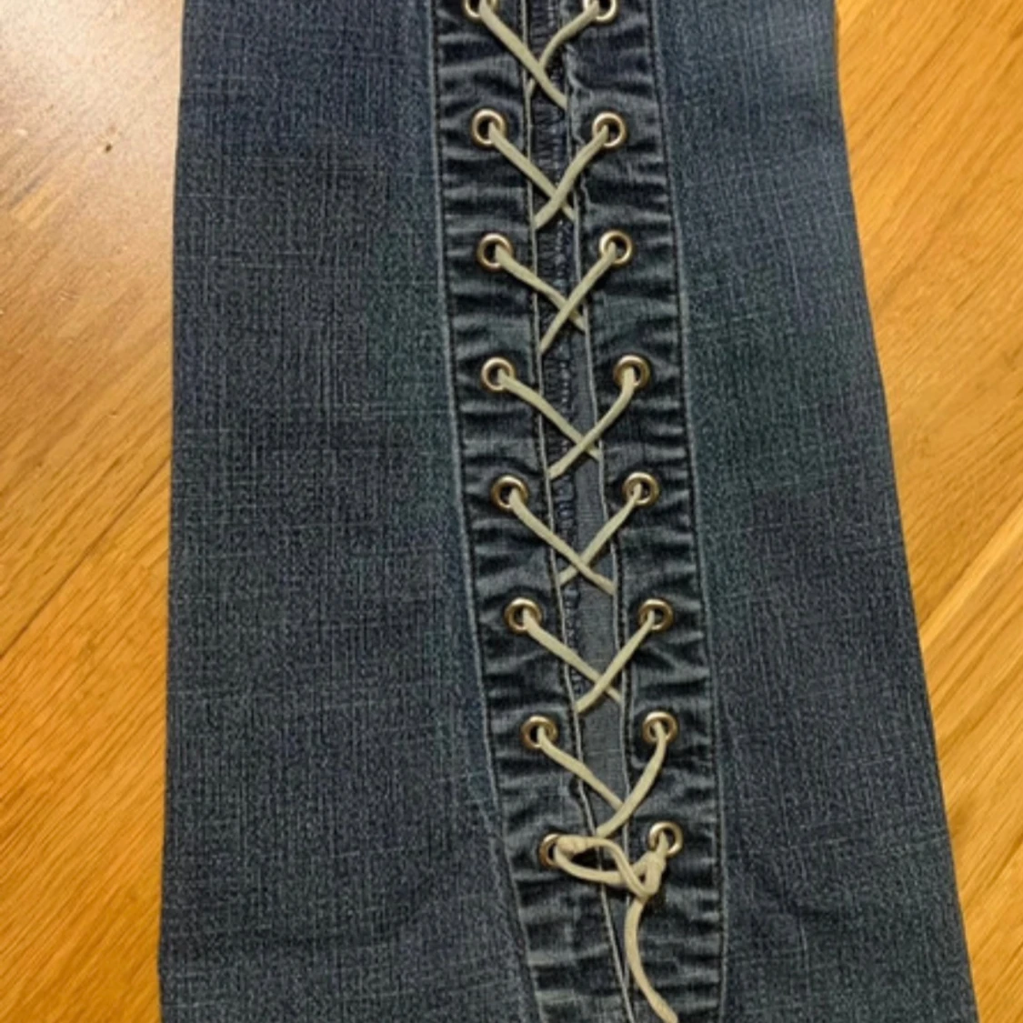 Sjukt coola jeans, perfekt om man vill ha något som sticker ut och gör outfiten lite extra!! Midjemåttet är 39cm, innerbenslängd är 79.