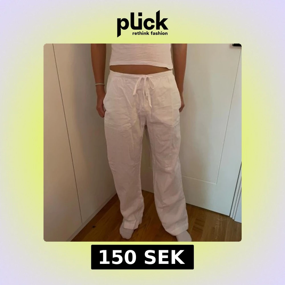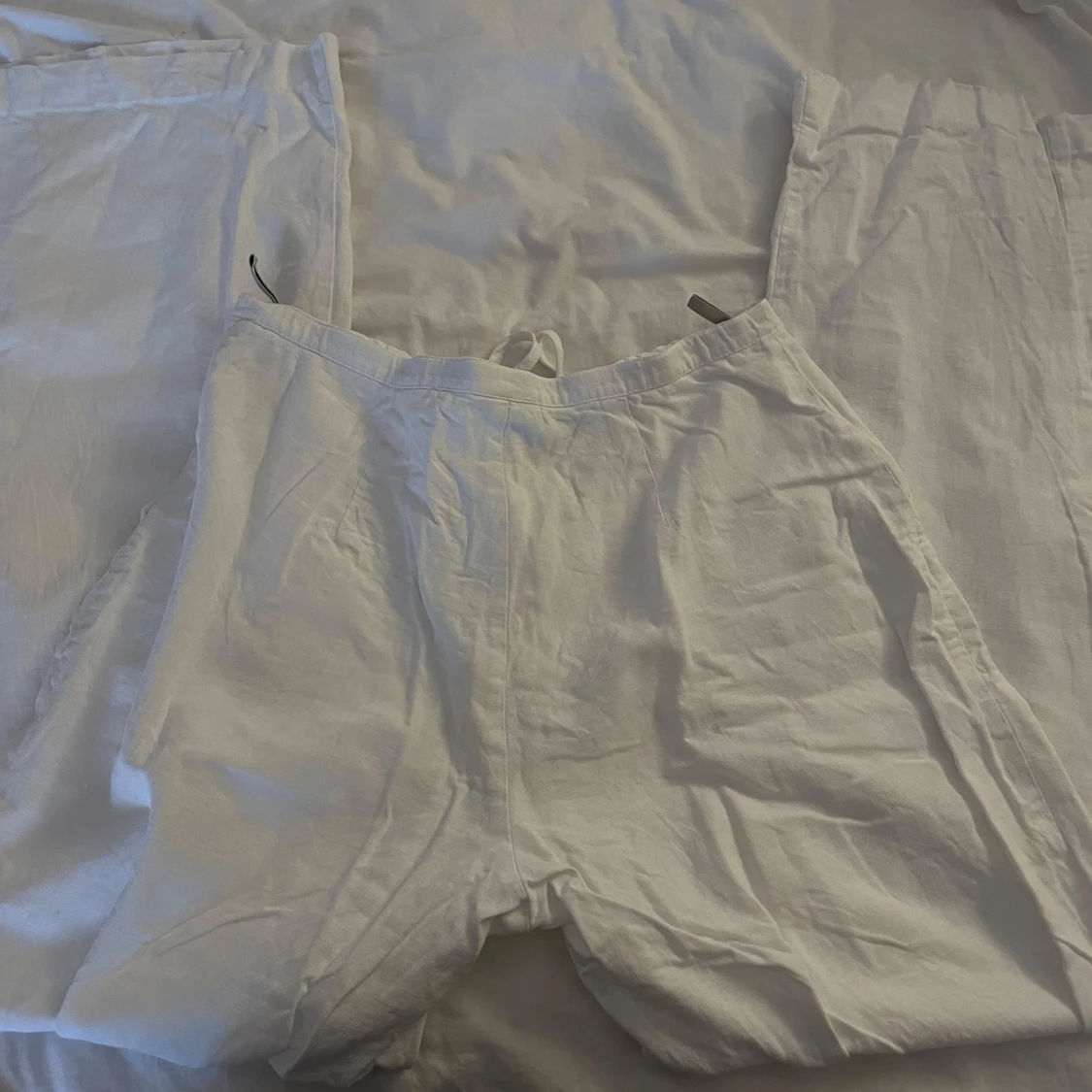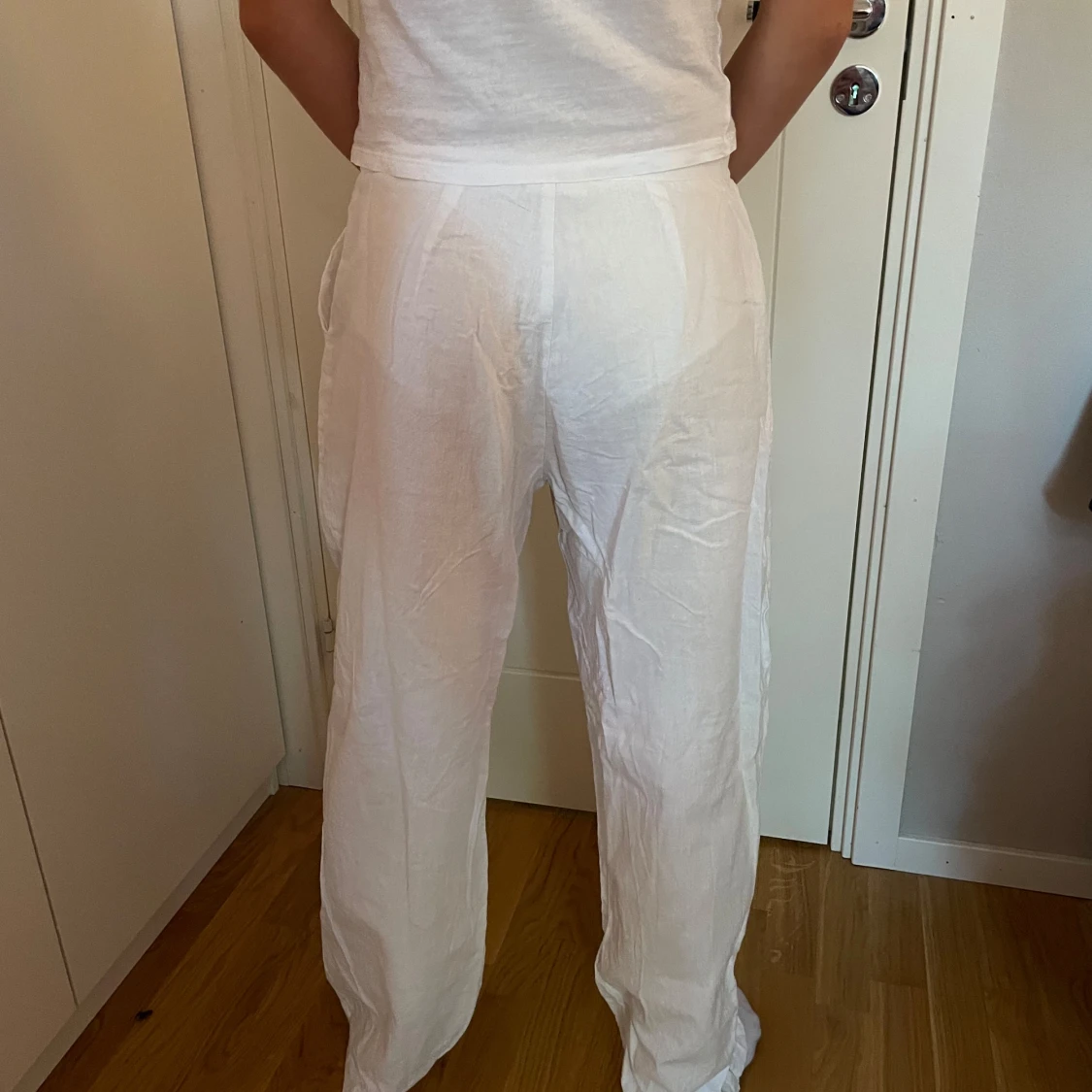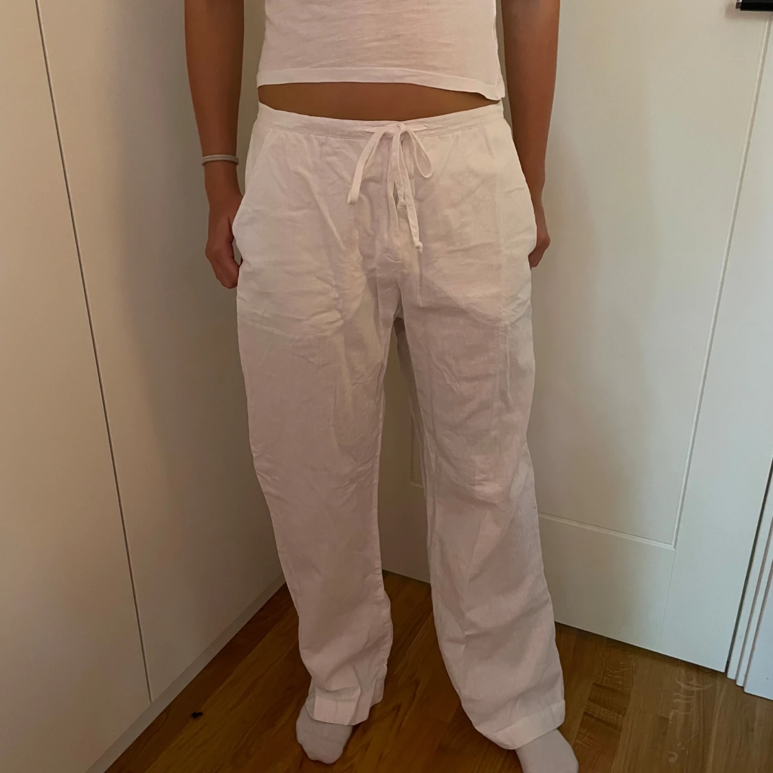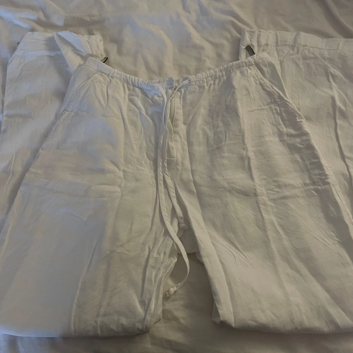 Ett par riktigt snygga vita lågmidjade linnebyxor. Linnebyxorna har både dragkedja och snören! Använd flera gånger men i ett superbra skick, förutom lite slitna nertill! 💗