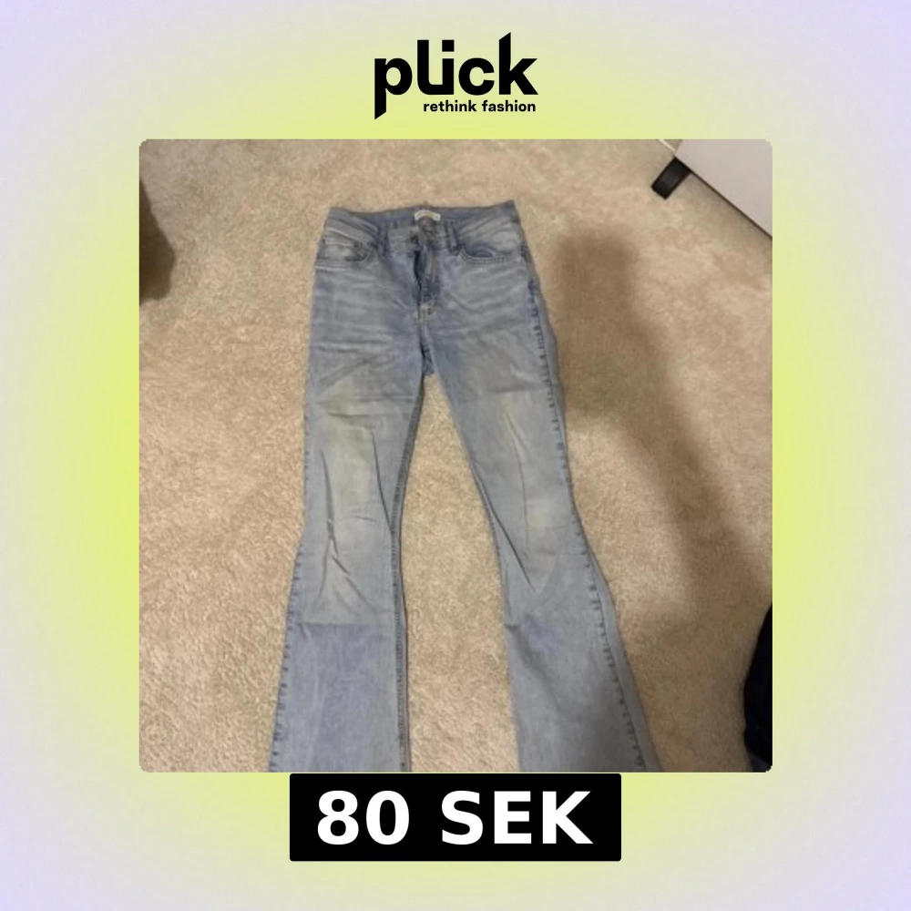 Ljusblå bootcut jeans - Snygga jeans som passa mig som är 173cm. Passar s/m. De är i storlek 38. Jag har sprätt upp nertill, som syns på bilden. Låg/medel i midjehöjd.