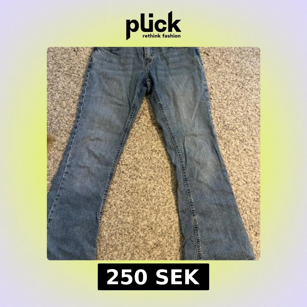 Snygga blå jeans med bootcut-stil. 38 i storlek men dom är tyvärr för korta på mig som är 170 cm lång. Perfekt i skick och har en fin detalj framtill som täcker knappen.