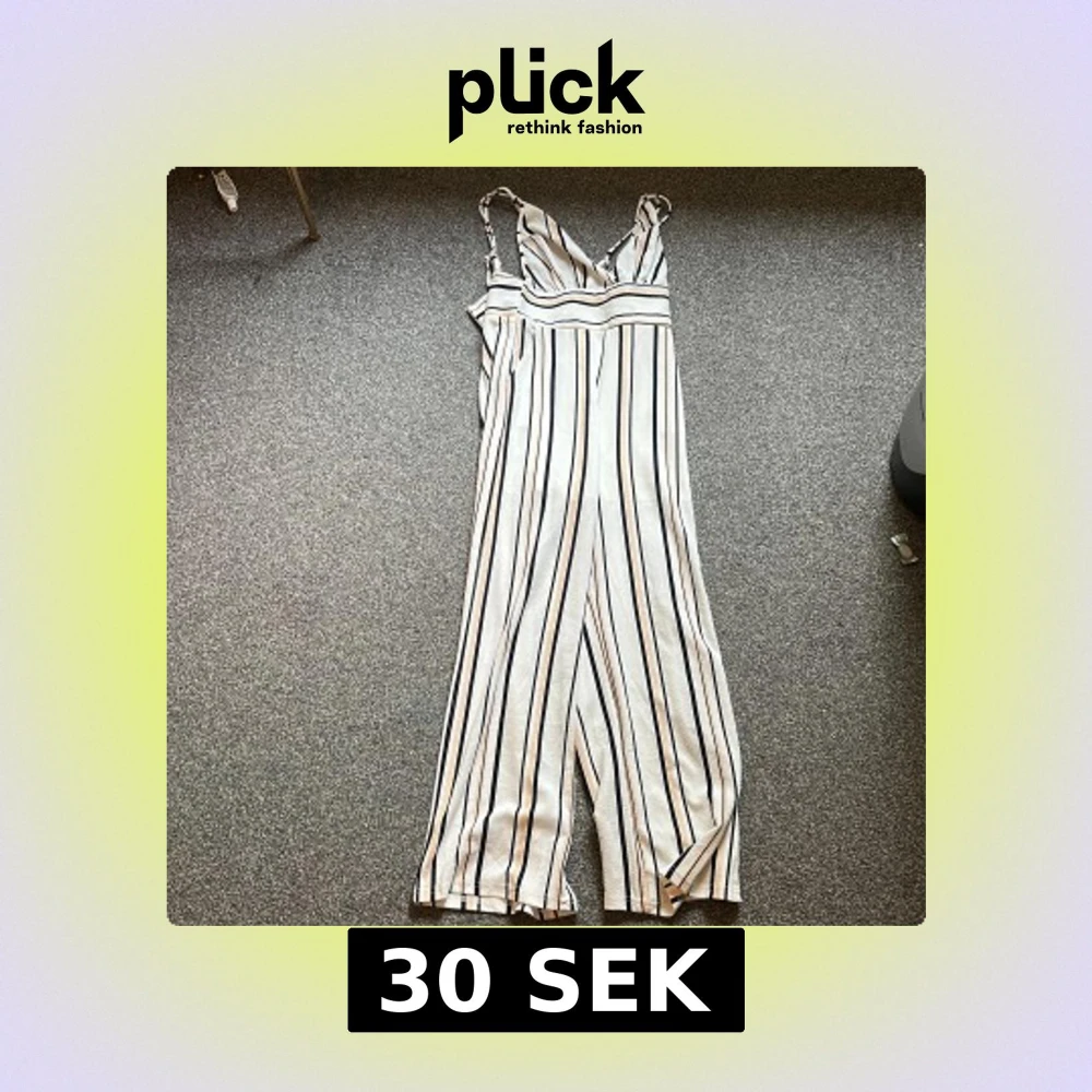 Säljer en snygg byxdress med smala axelband och djup v-ringning. Den är vit med svarta och beige vertikala ränder, har markerad midja och vida ben. Perfekt för dig som gillar en trendig och luftig look. Materialet känns lätt och skönt mot huden.
