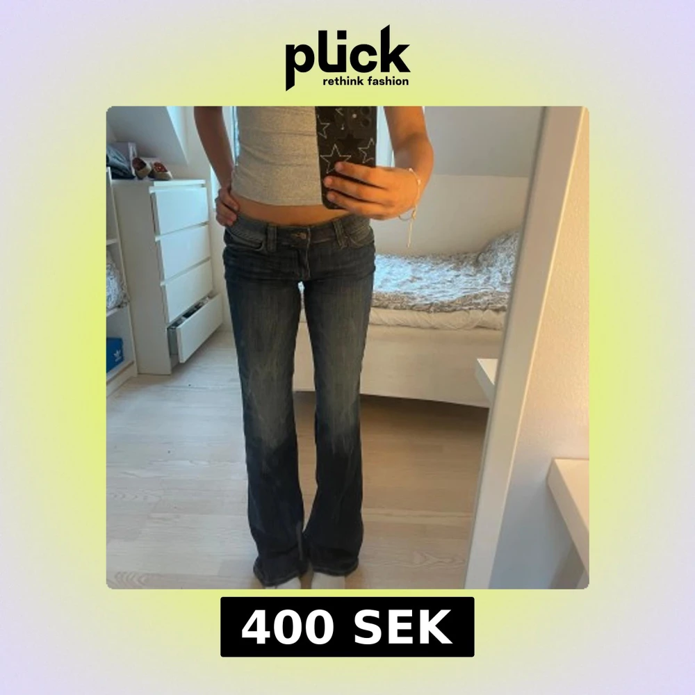 Säljer ett par mörkblå bootcut jeans från Weekday med låg midja. Hemsidans storlek 30/34